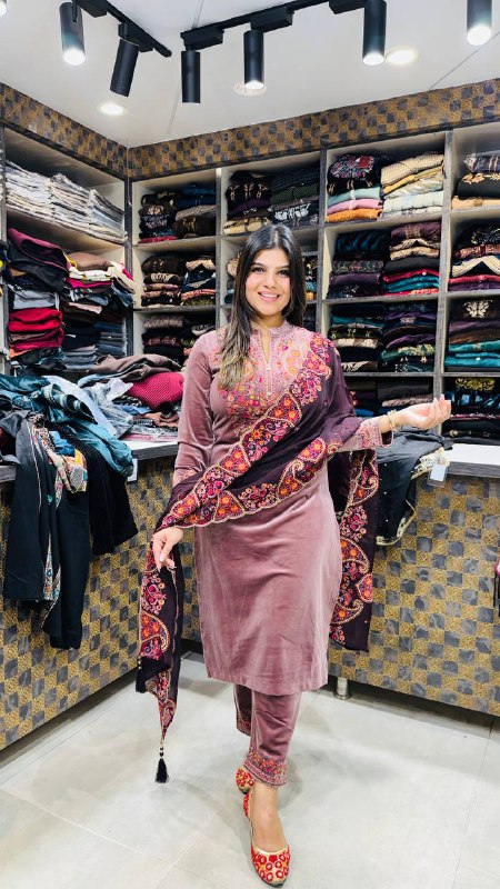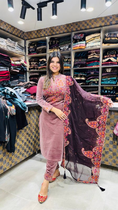 The fabric is soft, stretchable, and winter-friendly, offering comfort with a polished fall. The matching velvet pants maintain a clean, balanced silhouette, while the sheer embroidered dupatta adds contrast with paisley and floral borders that elevate the entire look. Designed for festive winters and graceful everyday luxury.