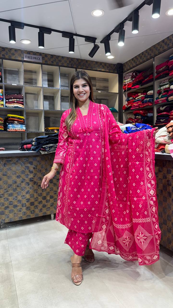 Raqsina is a vibrant Premium Cotton ensemble in a striking rani pink shade, designed to make a bold yet graceful statement. The shirt features intricate traditional block-inspired motifs spread evenly across the fabric, complemented by detailed vertical borders and geometric patterns that enhance its ethnic charm.