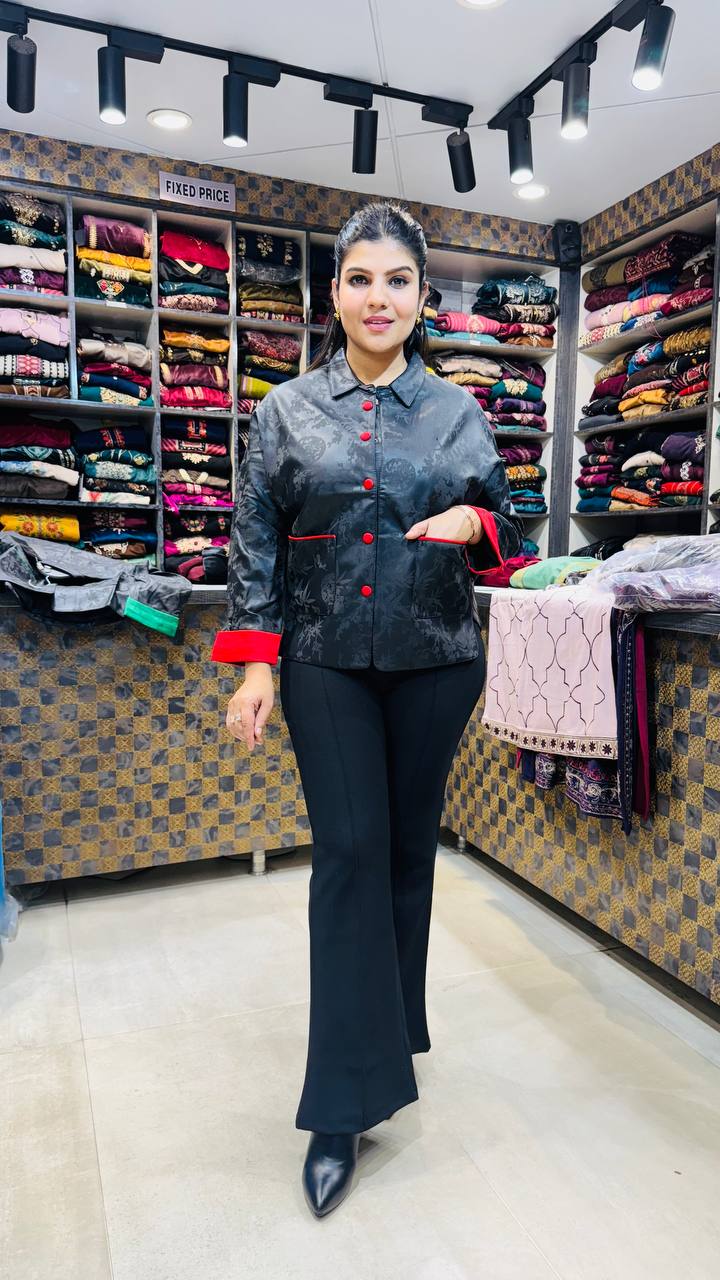 β¨ Design: Textured Leather Finish β’ Contrast Red Buttons & Cuffs β’ Front Pocket Detailing β’ Structured Fit