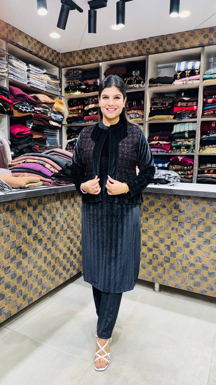 Ravena is a refined Premium Velvet ensemble crafted in a deep charcoal-black tone, designed for sharp winter elegance. The base shirt features a sleek, minimal velvet finish that keeps the silhouette clean and elongated.
