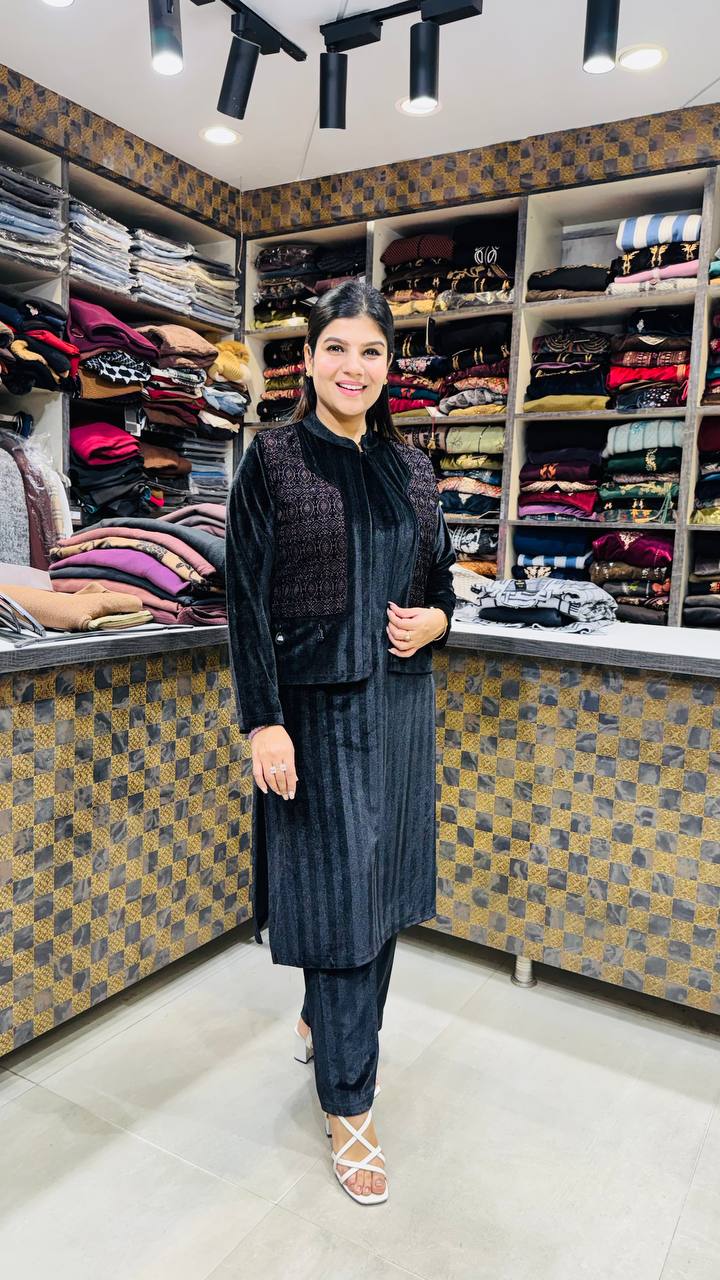 The highlight is the structured velvet jacket, detailed with intricate tonal embroidery across the front panel, adding richness without overpowering the look. The matching straight pants maintain balance and comfort, making this set ideal for formal evenings, winter gatherings, and understated festive wear.