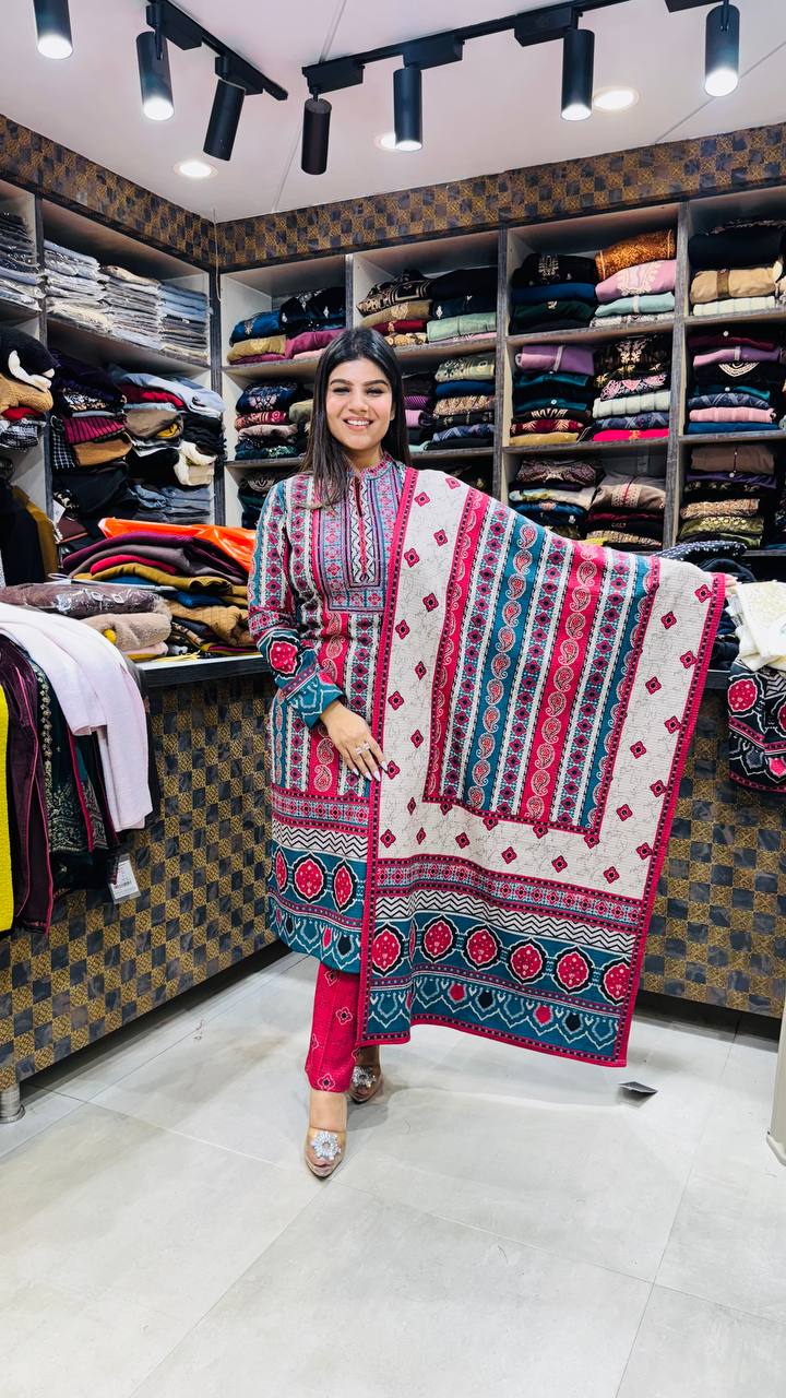 A vibrant Teal–Crimson Printed 3-piece suit crafted from Premium Imported Soft, Warm & Lint-Free fabric. The kurti features intricate ethnic block prints in teal, crimson, ivory, and charcoal, highlighted with geometric borders and mini motifs all over. The matching trouser carries coordinated prints, while the dupatta showcases striped paisley and floral patterns, giving a beautifully balanced traditional look.
