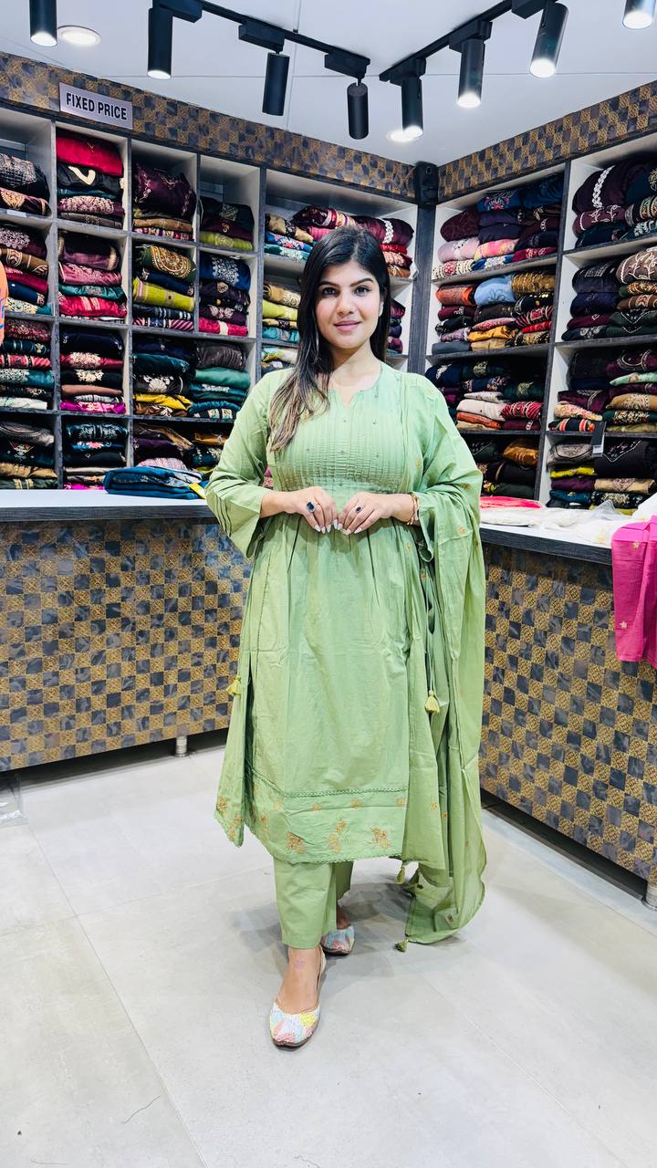 Rehana is a soft Pistachio Green cotton suit set designed with a clean, airy silhouette. The kurta features fine pin-tuck detailing on the yoke, complemented by delicate floral thread motifs near the hem. The sleeves include subtle tie-up tassels that keep the look graceful without overdoing it.