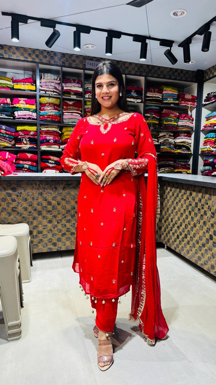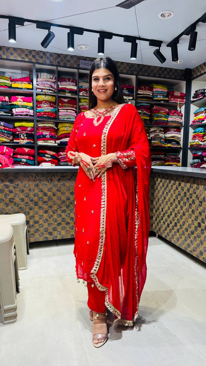 A radiant red ensemble that brings out festive grace with effortless charm. The kurta, detailed with golden zari and sequin work, pairs beautifully with a matching dupatta finished in gota lace and solid pants for a complete elegant look. Designed for celebrations and evening gatherings, this outfit captures timeless beauty in every thread.