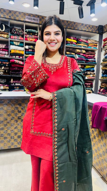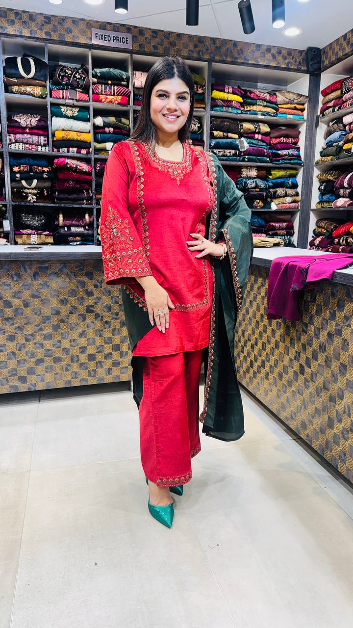 The matching red cotrize pants keep the silhouette clean and structured, while the deep green dupatta with embroidered edging adds richness and depth to the overall look. Lightweight yet graceful — designed for festive gatherings and formal ethnic wear.