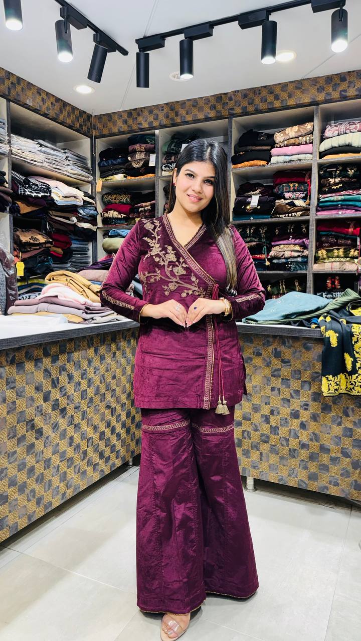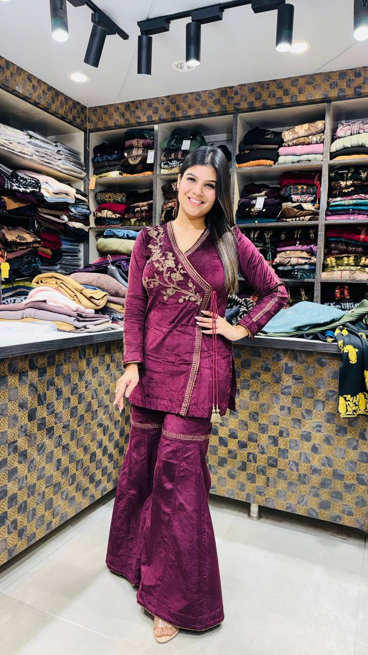 Riwaq is a Premium Cotrize 2-Piece Gharara suit designed in a deep wine-plum tone that reflects classic richness with festive grace. The shirt features an elegant wrap-style front highlighted by antique gold floral embroidery and a delicately finished border, adding depth and movement to the design.