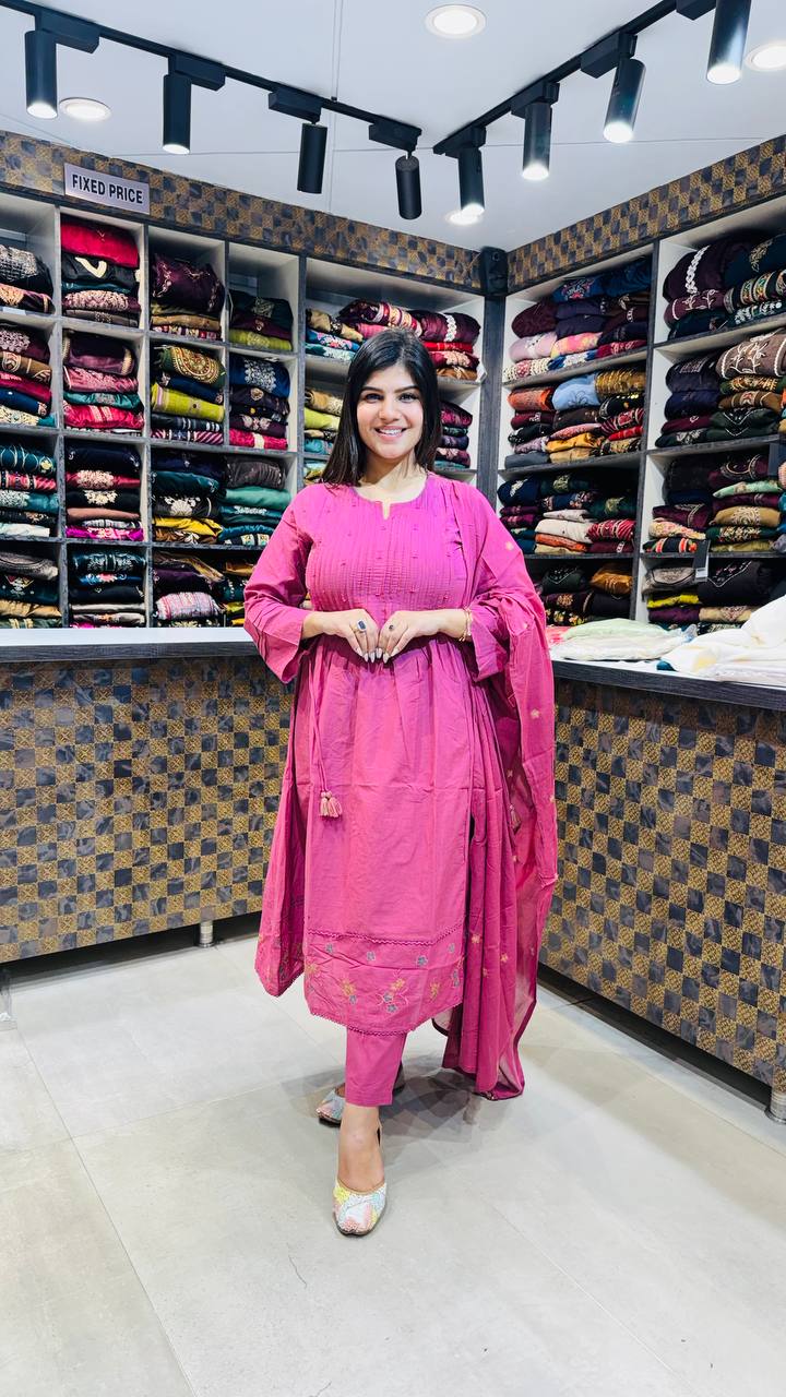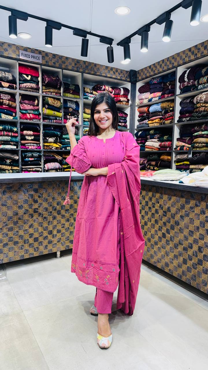 Rosalia is a soft Pink cotton 3-piece set designed with delicate tone-on-tone floral embroidery. The kurti features subtle stitched panel work, gathered flare for a graceful fall, and minimal thread motifs that add an elegant handcrafted feel.