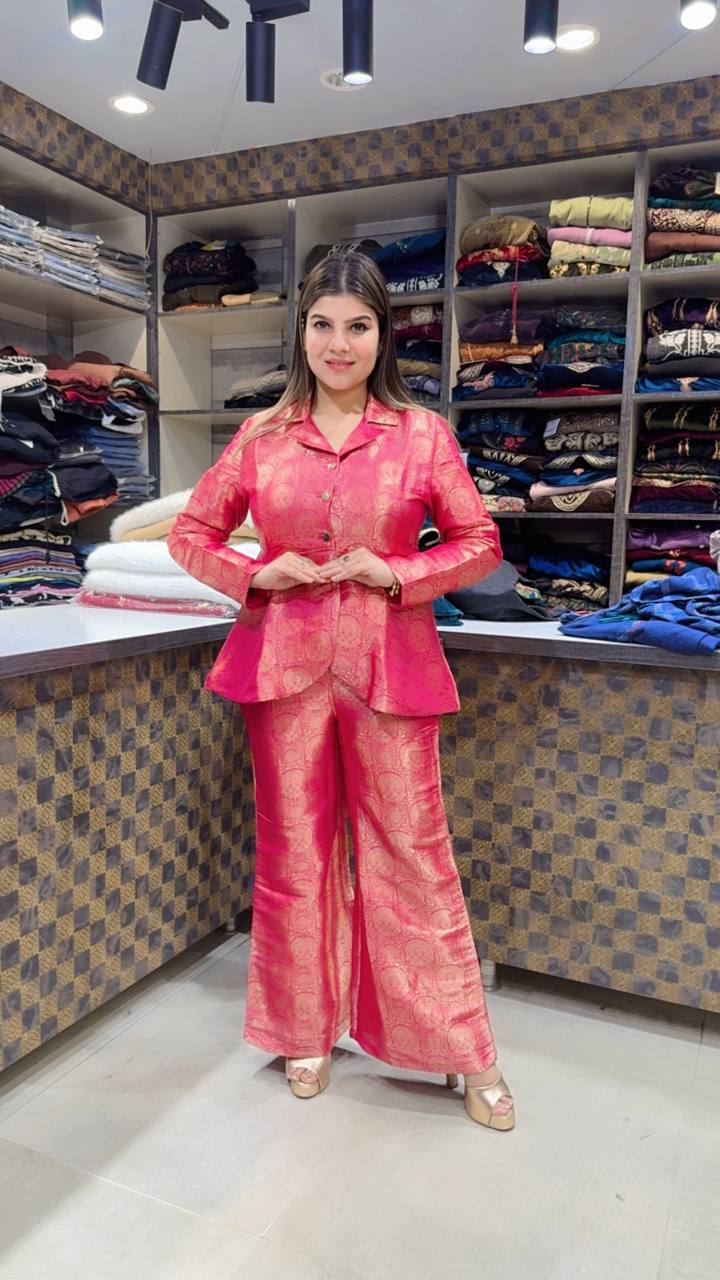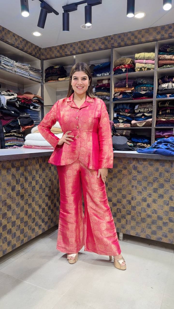 Rosava is a Premium Brochet 2-Piece set crafted in a rich rose-pink base with soft golden woven motifs throughout. The shirt features a tailored silhouette with a structured collar and front button detailing, giving it a refined yet contemporary look.