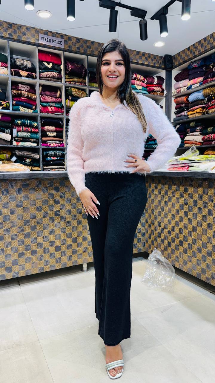 Roselle is a Premium Woolen winter knit in a soft blush pink tone, designed for cozy elegance with a modern silhouette. The sweater features a plush, fuzzy texture that adds warmth and visual softness, making it perfect for cold days without looking bulky.