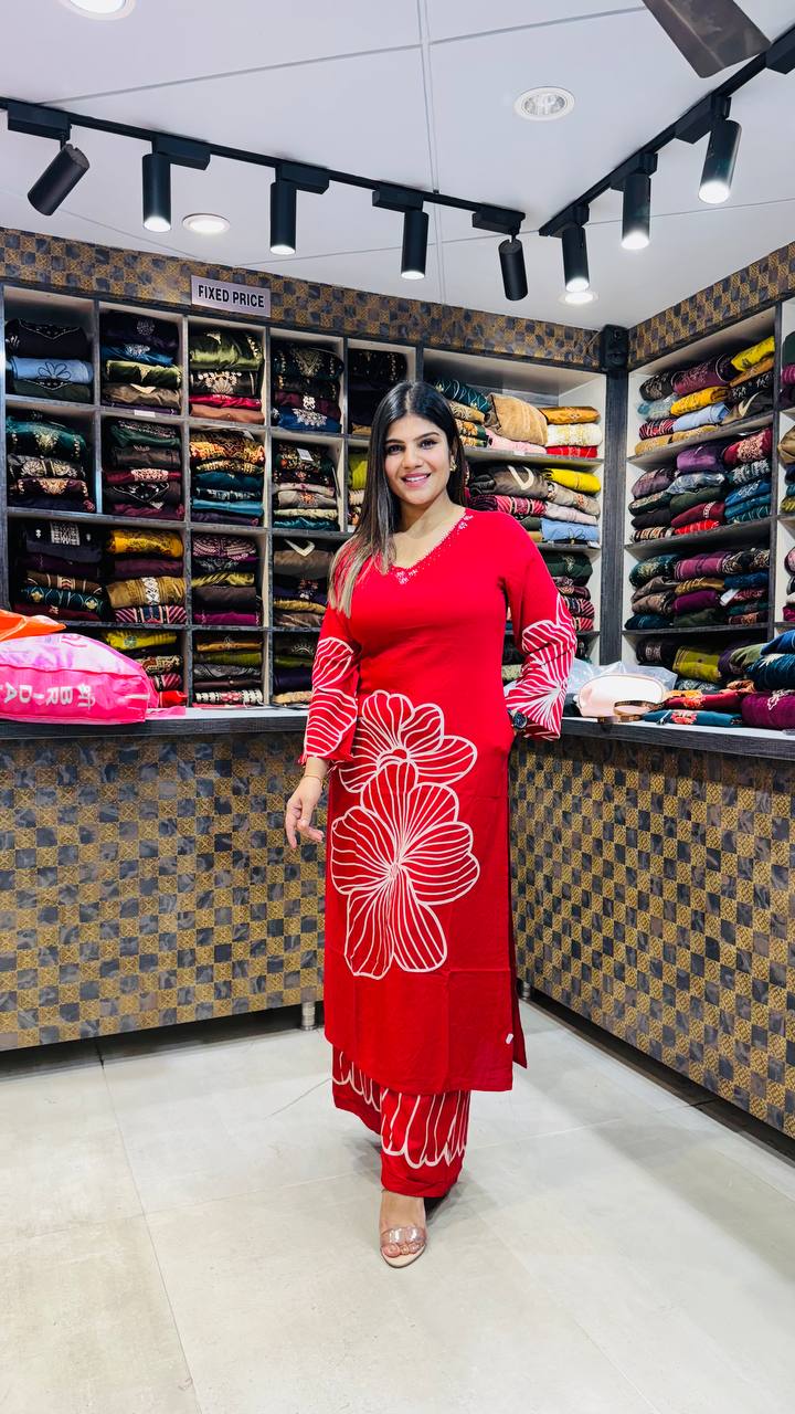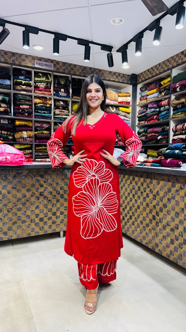 A stunning red ensemble crafted in premium German cotton, Roselure brings together vibrance and elegance. The kurta showcases bold white floral line embroidery that feels both artistic and modern, while the flared sleeves add a touch of drama. Paired with matching printed bottoms, this outfit is perfect for festive occasions or statement casual wear.