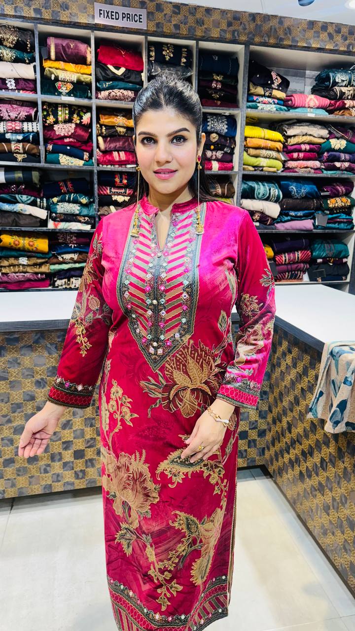 Roshna is a striking Premium Velvet ensemble crafted in a bold deep rose-pink base that instantly commands attention. The shirt is adorned with ornate antique-gold floral motifs flowing across the front, sleeves, and hem, creating a rich traditional statement.