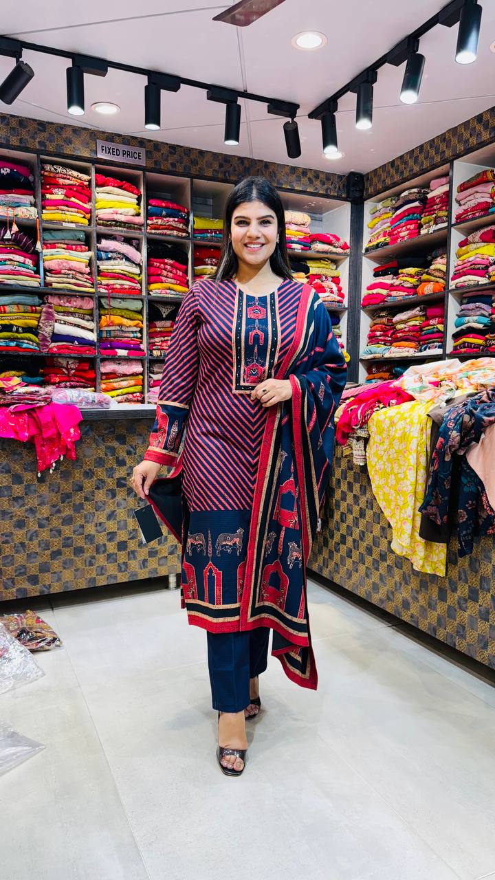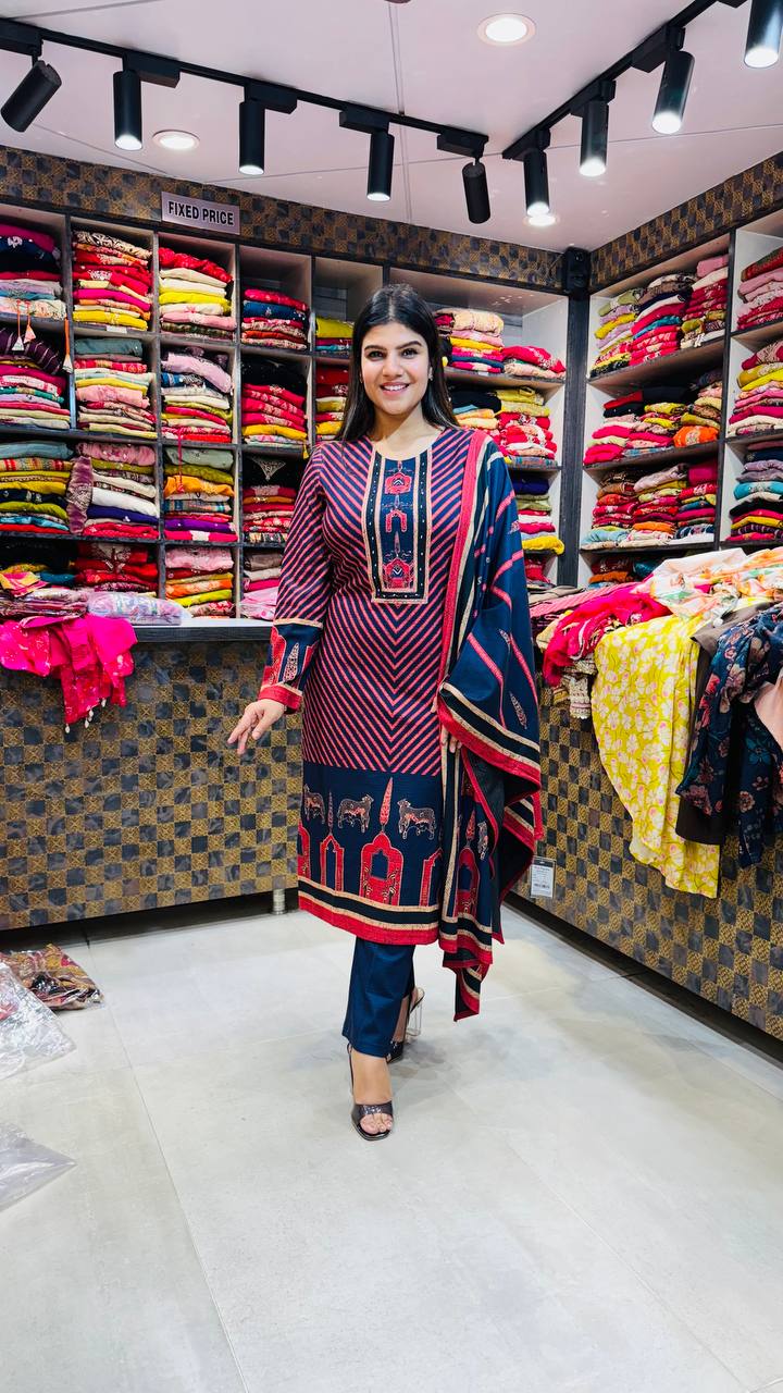 This elegant ensemble in premium imported fabric beautifully blends tradition with a touch of royalty. The navy-blue base is accentuated with diagonal red stripes and intricate block-style prints featuring regal elephant motifs — giving it a rich, heritage-inspired appeal. The neckline is adorned with fine detailing that enhances its sophistication. Paired with matching navy pants and a printed dupatta that carries the same royal charm, this outfit is perfect for festive events or graceful day functions.
