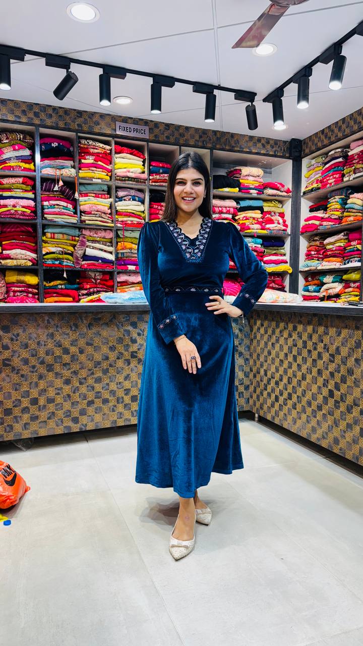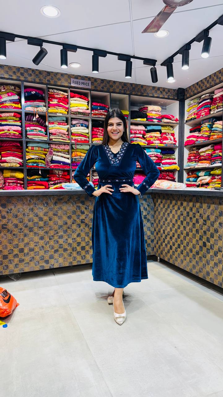 Drape yourself in luxury with this Premium Velvet masterpiece in deep royal blue. The long gown-style silhouette features a delicately embroidered neckline and cuff detailing that adds a regal touch to its timeless elegance. The soft, plush velvet fabric enhances the richness of the color while offering unmatched comfort and sophistication. Perfect for evening soirΓ©es, festive dinners, or winter celebrations β this piece defines refined glamour with a modern edge.