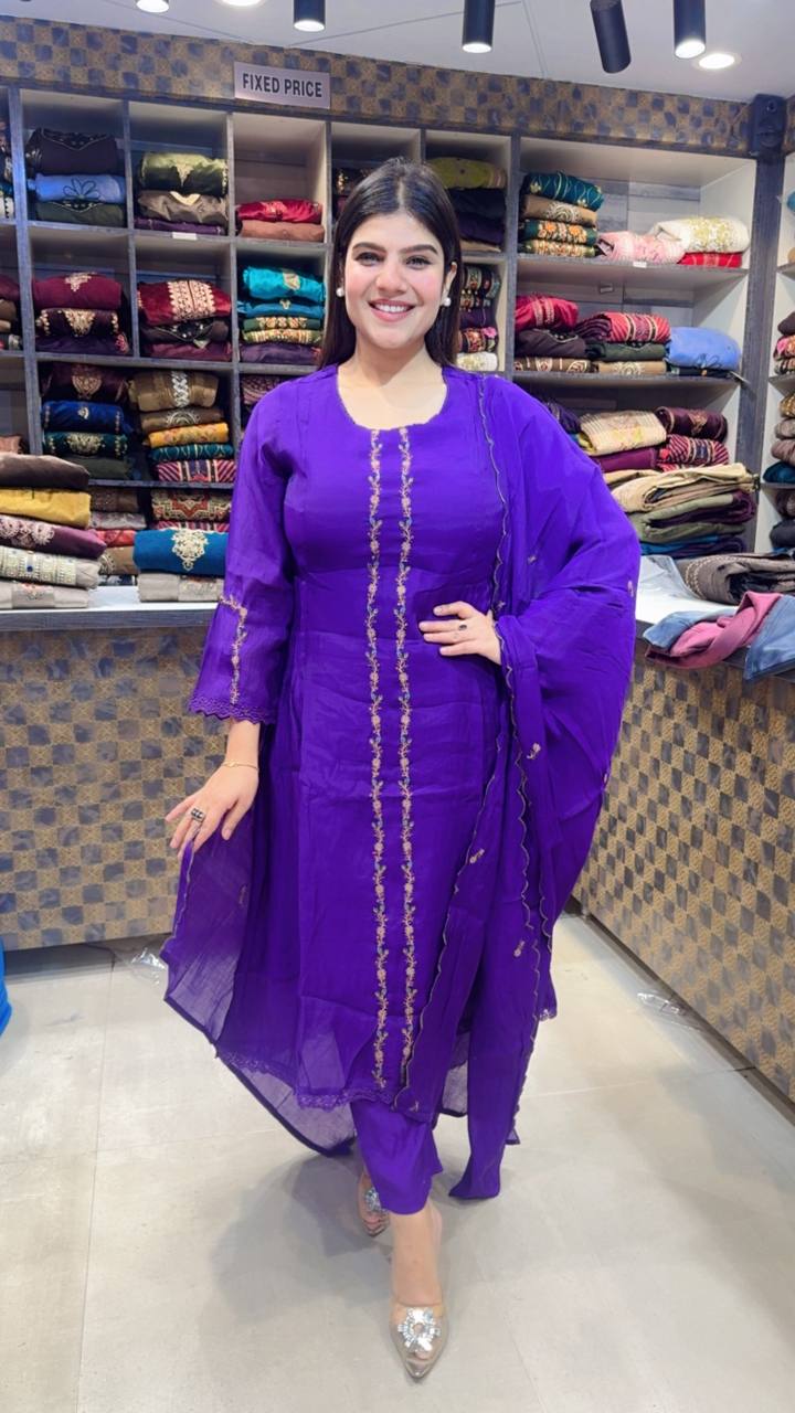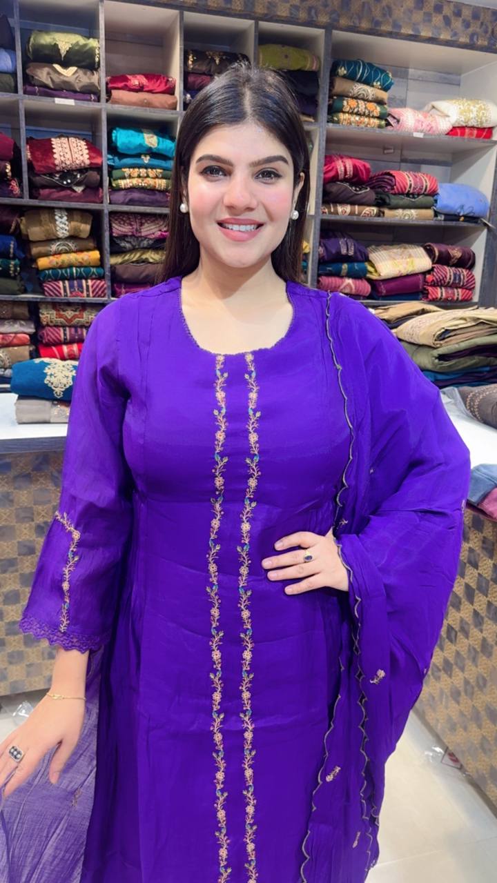 A timeless ensemble in a deep royal purple hue, crafted from Mall Chanderi fabric that radiates regal charm. The kurta features delicate vertical zari embroidery running gracefully along the front and sleeves, creating a sleek elongated silhouette. Paired with matching pants and a soft dupatta edged with subtle detailing, this outfit perfectly balances elegance and simplicity β ideal for festive evenings and graceful gatherings.