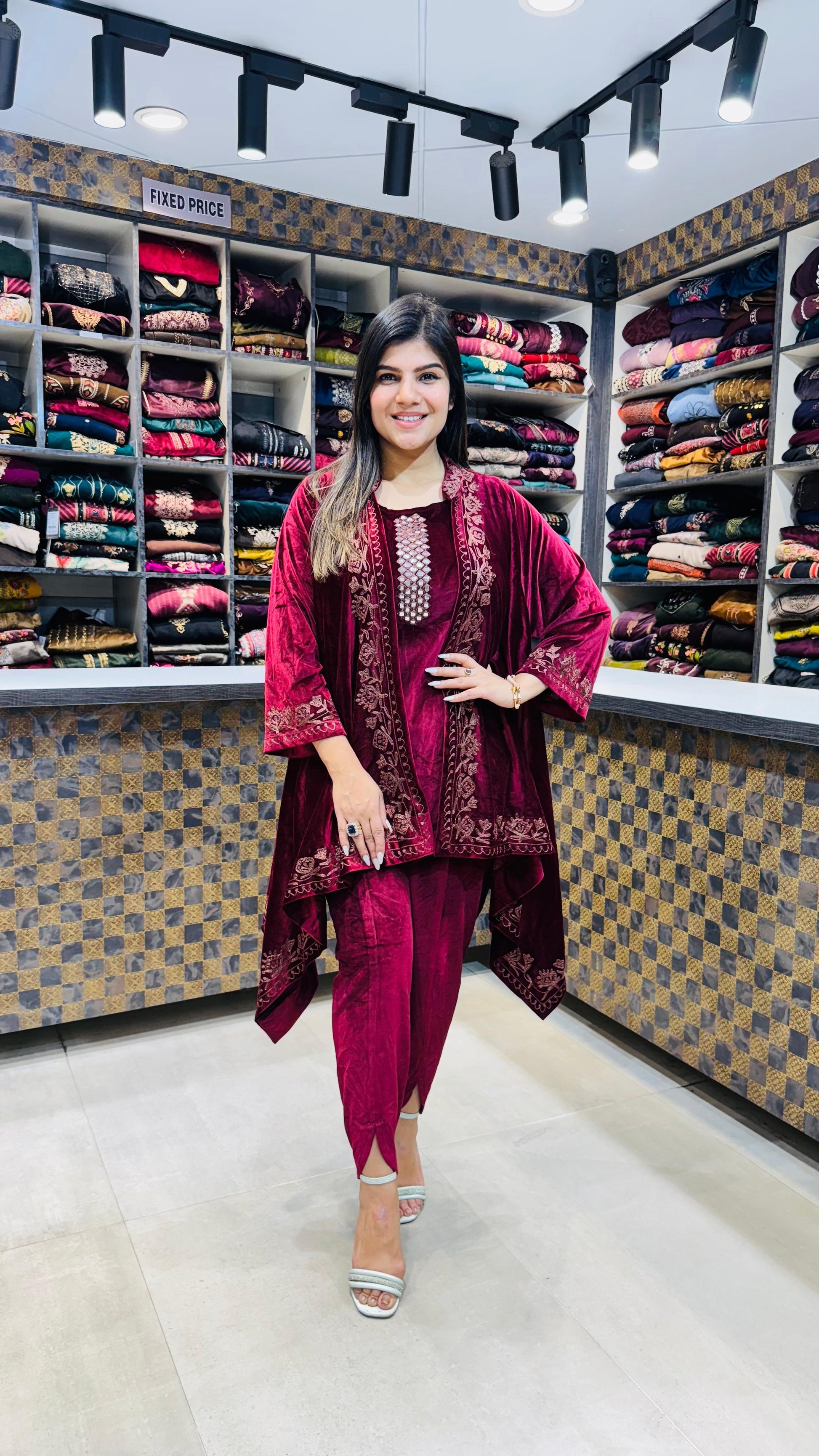 ✨ Design: Embroidered Neckline • Detailed Sleeves • Layered Velvet Silhouette • Straight Fit