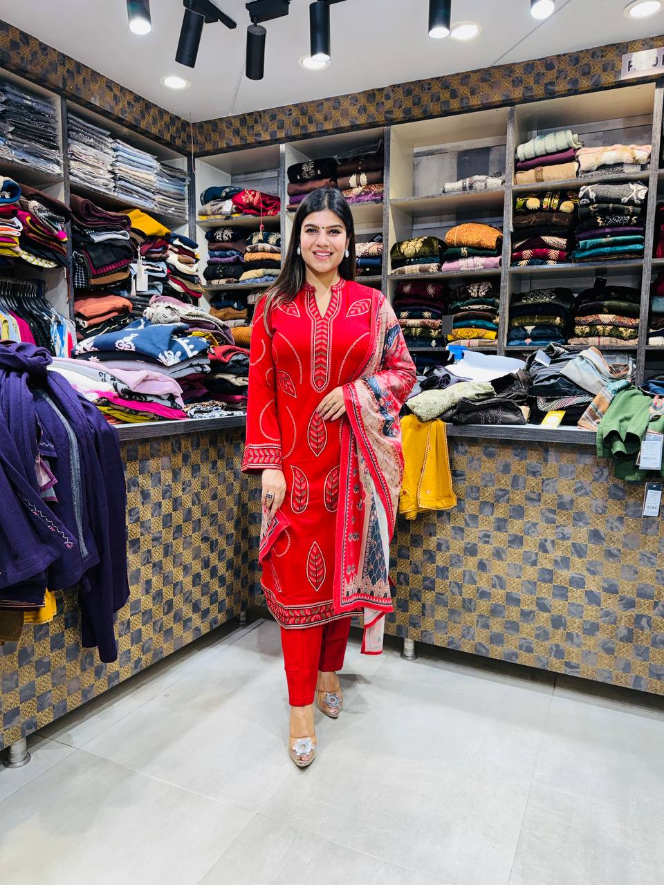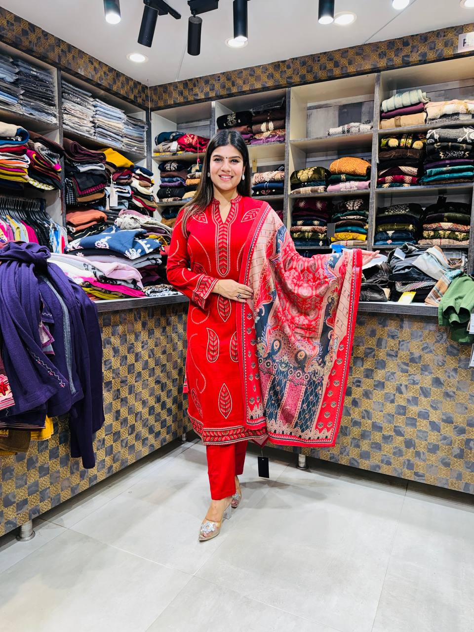 Step into bold winter elegance with our Soft & Warm Knitted 3-Piece Suit in a striking Ruby Red shade. The kurta features beautifully crafted leaf-pattern embroidery in contrasting tones, adding a vibrant ethnic touch. Paired with matching straight-fit pants and a richly printed dupatta showcasing artistic motifs, this set blends warmth, comfort, and festive charm effortlessly. Perfect for winter outings, family gatherings, or celebratory moments, Rubywarm delivers a statement look with cozy sophistication.