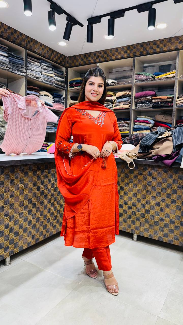 A bold and elegant ruby red suit crafted from premium crepe fabric, offering a smooth texture and graceful fall. The kurta features a beautifully detailed mirror-work embroidered neckline that adds a subtle festive sparkle. Paired with a matching dupatta and straight pants, this outfit creates a refined traditional look with a modern touch. Perfect for festive gatherings, celebrations, and evening occasions where you want a confident and elegant appearance.