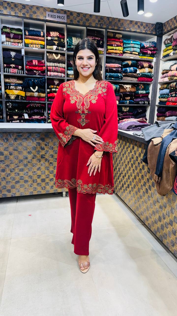 Rumeira is a Premium Imported Knitted 2-Piece set crafted in a rich ruby red tone that stands out with warmth and elegance. The soft knitted shirt features intricate antique-gold embroidery across the neckline, sleeves, and hem, giving it a graceful festive character without feeling heavy.