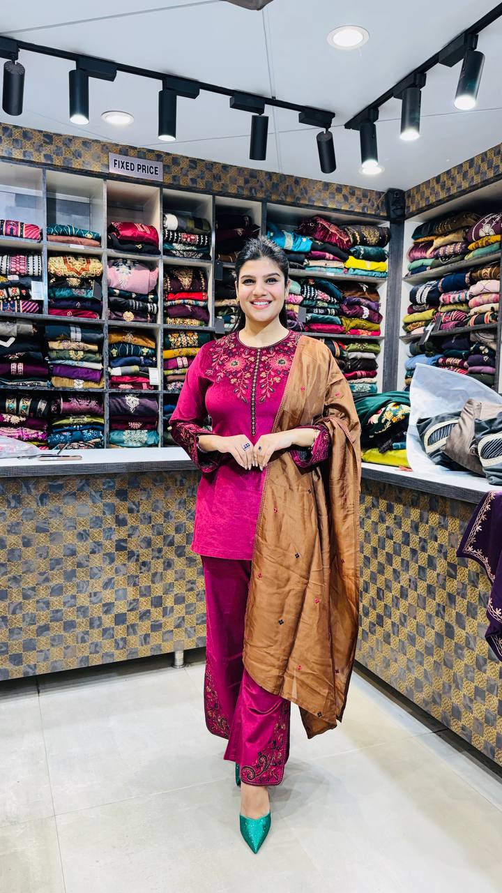 Rumeira is a refined Premium Cotrize 3-Piece suit crafted for rich festive elegance. The shirt comes in a deep berry-magenta tone, elevated with intricate floral embroidery across the neckline, sleeves, and hem β detailed enough to look luxurious without being loud.
