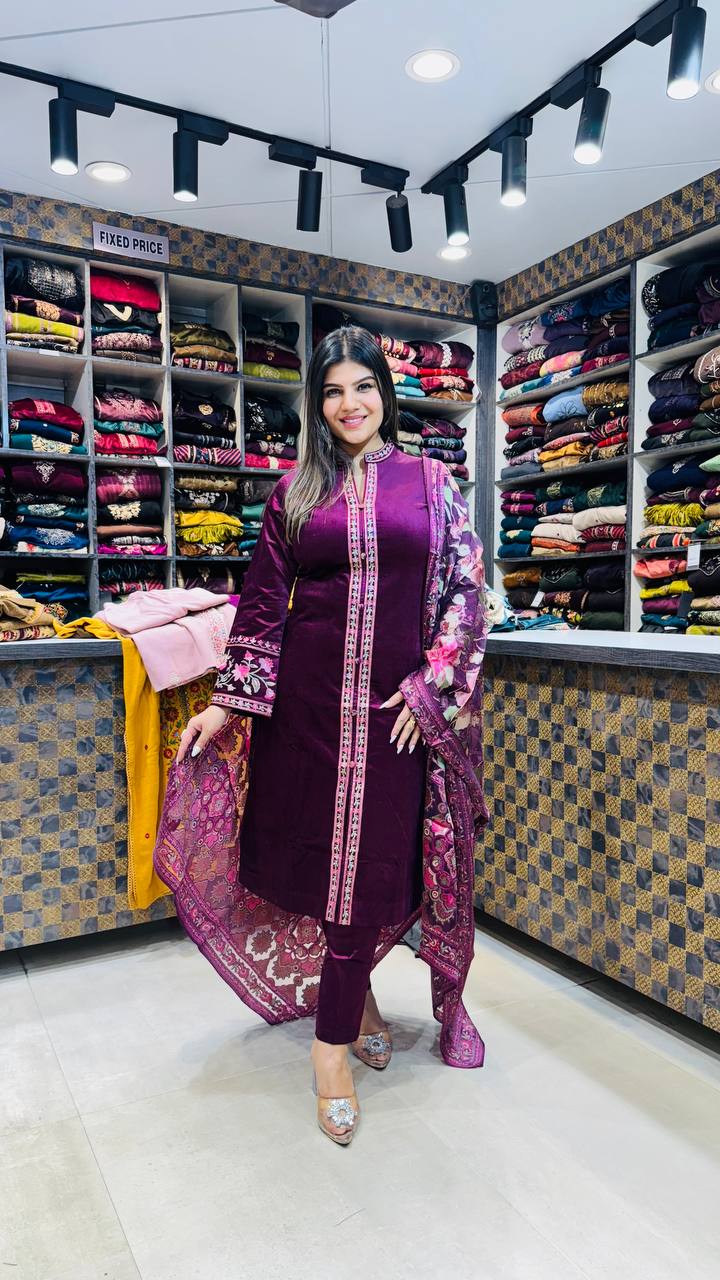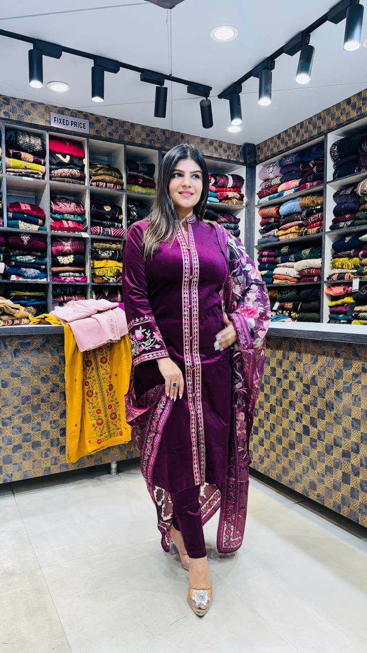 Ruqayya is a Deep Plum Premium Velvet 3-piece suit featuring a straight, structured silhouette with embroidered panel work running down the front.
