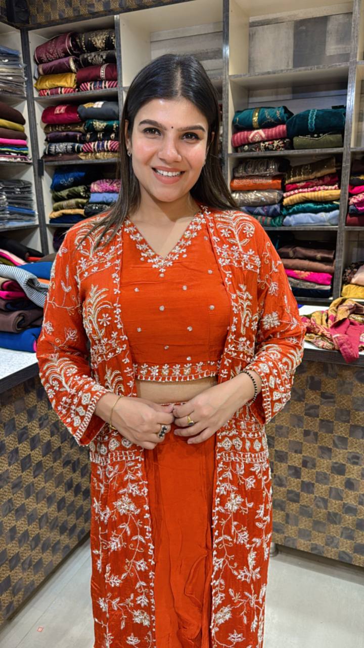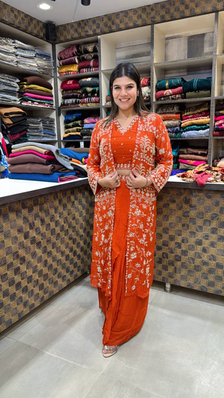A stunning 3-piece set in rich rust orange crafted on premium soft Chinon fabric. The long shrug features intricate white thread embroidery in floral vines and garden motifs, giving it a festive and elegant appeal. The inner choli comes with subtle detailing for a sleek silhouette, paired with a flowy matching Chinon skirt for an effortlessly graceful look. Perfect for mehendi functions, festive get-togethers, or daytime weddings β lightweight, stylish and statement-worthy.