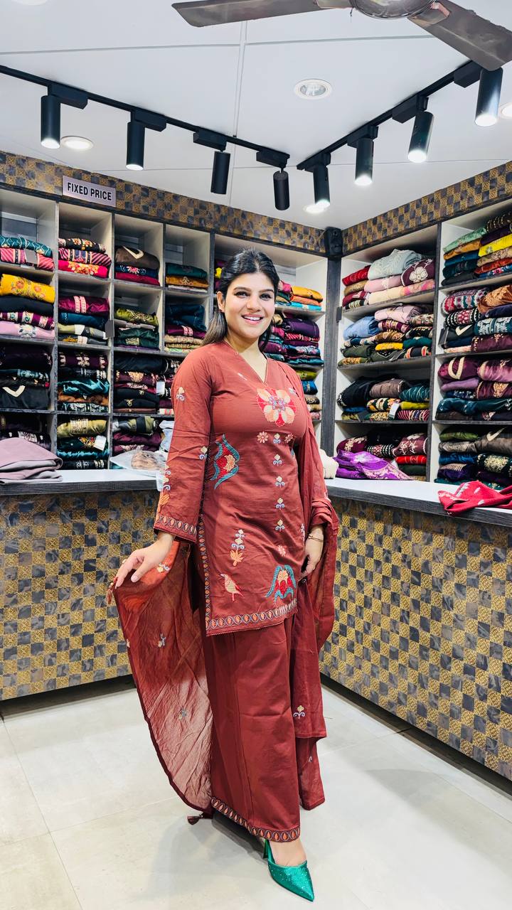 Rustara is a Premium Cotton 3-Piece suit crafted in a warm rust-terracotta tone that feels earthy, festive, and elegant at once. The cotton shirt features delicate multicolour embroidery placed symmetrically on the neckline, center panel, and hem, adding a handcrafted charm without overpowering the base colour.