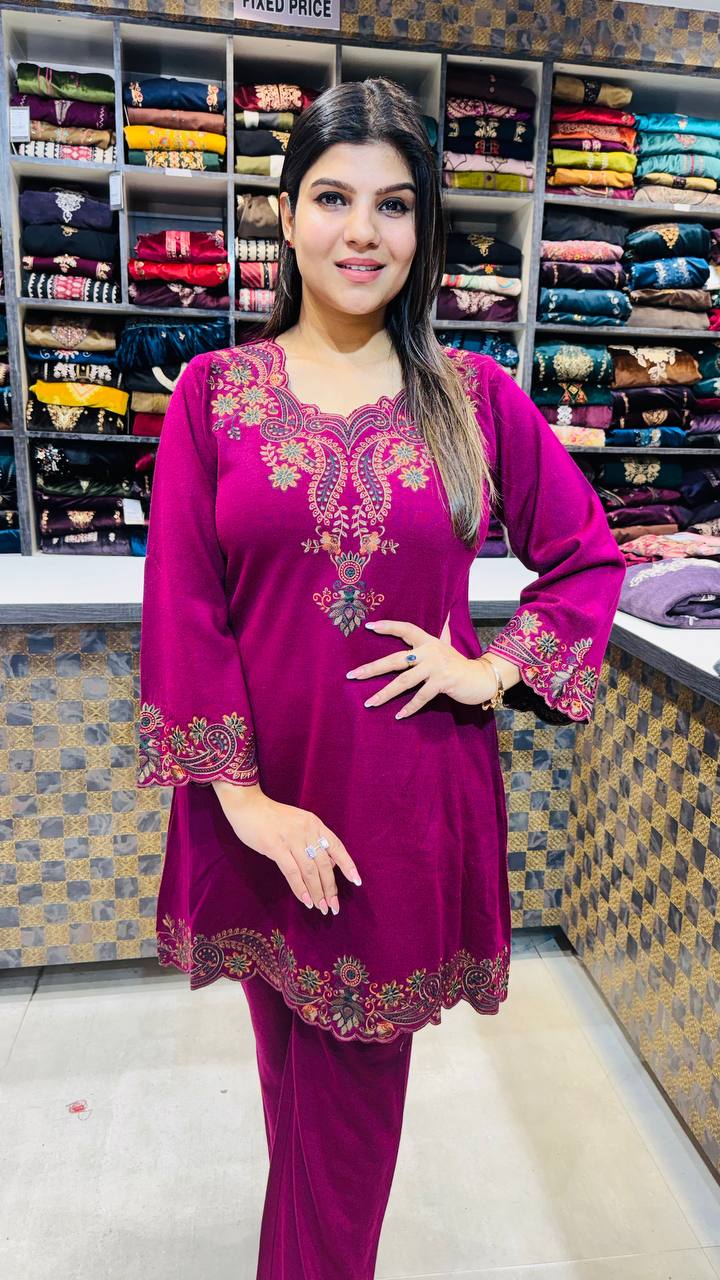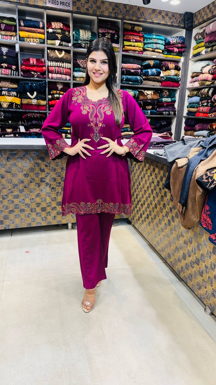 Ruvaya is a Premium Imported Knitted 2-Piece set crafted in a rich berry-wine shade that instantly stands out with warmth and depth. The shirt features delicate antique-gold embroidery across the neckline, cuffs, and hem, adding an elegant contrast to the smooth knitted base.
