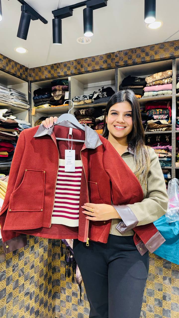 Ruvina is a Premium Korean Imported jacket crafted in a rich rust-brick red tone, designed for bold winter layering with a refined edge. The jacket features a structured silhouette with contrast leather-finish detailing on the collar, cuffs, and inner trim, adding depth and a high-fashion feel.