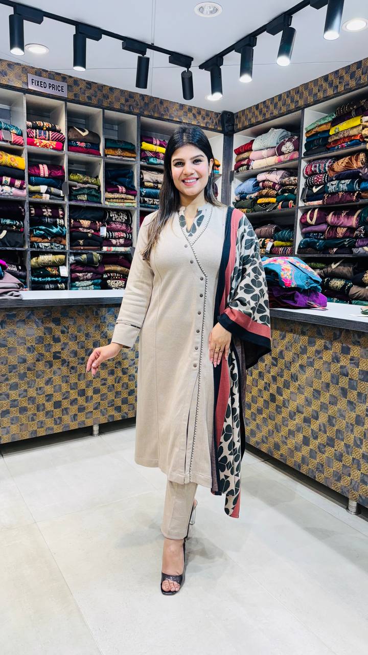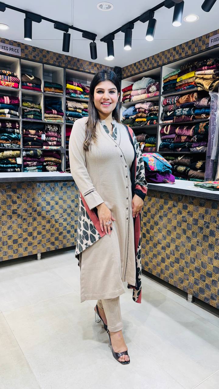 Safina is a Premium Imported Knitted 3-Piece suit crafted in a soft sand-beige tone that feels calm, refined, and winter-ready. The shirt features a clean, minimal front with button detailing, balanced by contrast printed panels on the sleeves and dupatta that add visual depth without overpowering the base colour.