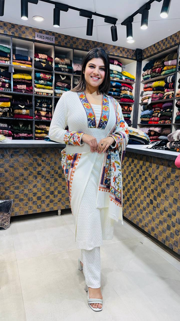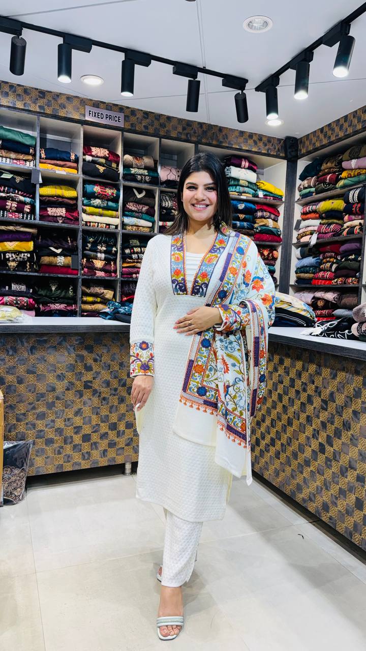 Safina is a Premium Woolen 3-Piece ensemble crafted in a soft ivory-white base, elevated with vibrant multicolour folk-inspired embroidery. The shirt features a textured woven surface with a richly embroidered neckline and sleeve borders, creating a striking contrast without overpowering the elegance.