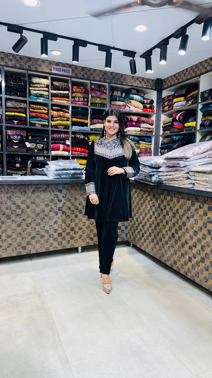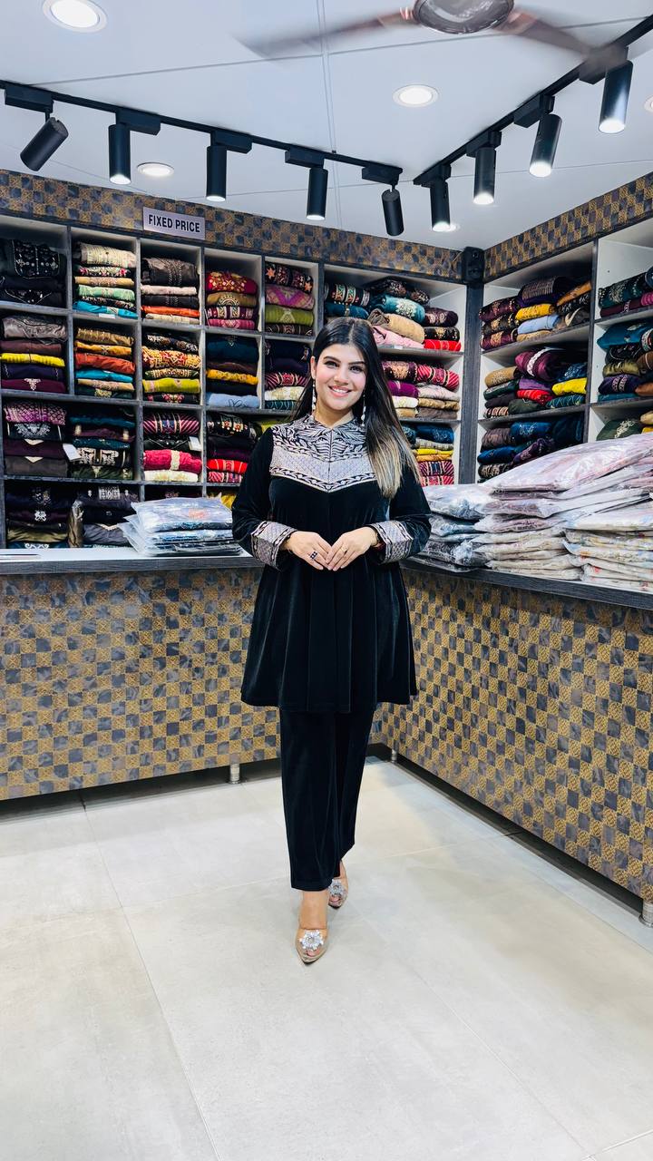 A rich Jet Black velvet 2-piece suit featuring an elegant yoke-style design with intricate geometric threadwork in silver, taupe, and muted gold. The flared kurti adds a graceful fall, while the sleeves carry matching detailing for a coordinated premium look. Paired with straight velvet pants, this set delivers a luxurious, winter-perfect statement outfit.
