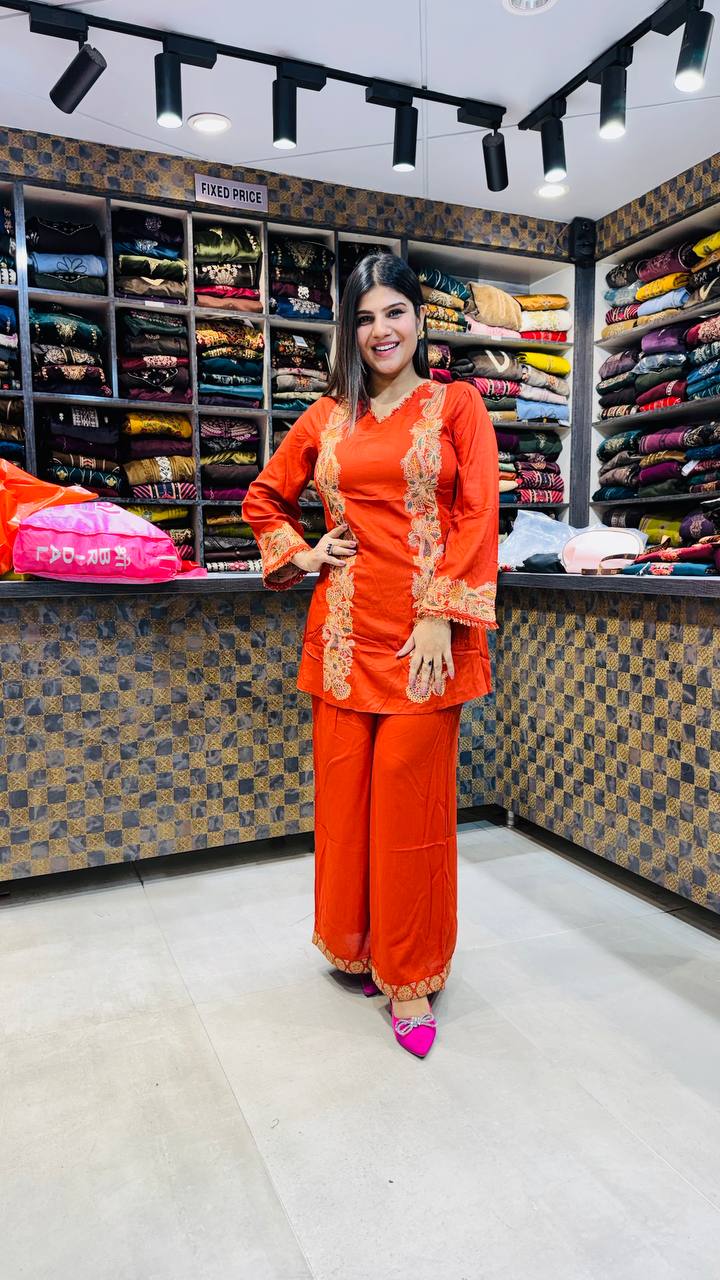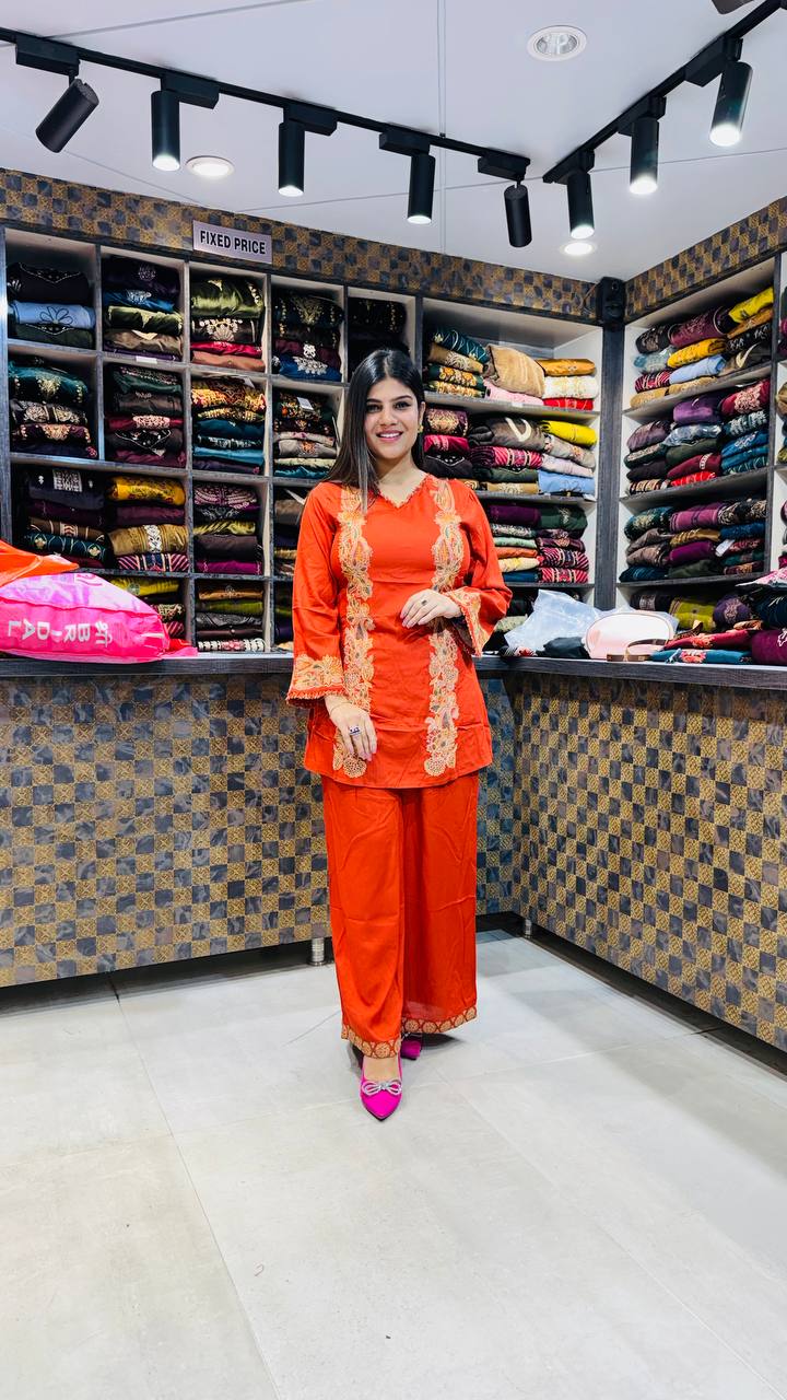 A bold and radiant set crafted from premium German cotton, “Zahraa” stands out with its vibrant orange shade paired with soft beige lace embroidery running along the front panels, sleeves and trouser hem. The elegant detailing adds femininity and structure, making it perfect for festive wear, casual outings or premium daily looks.