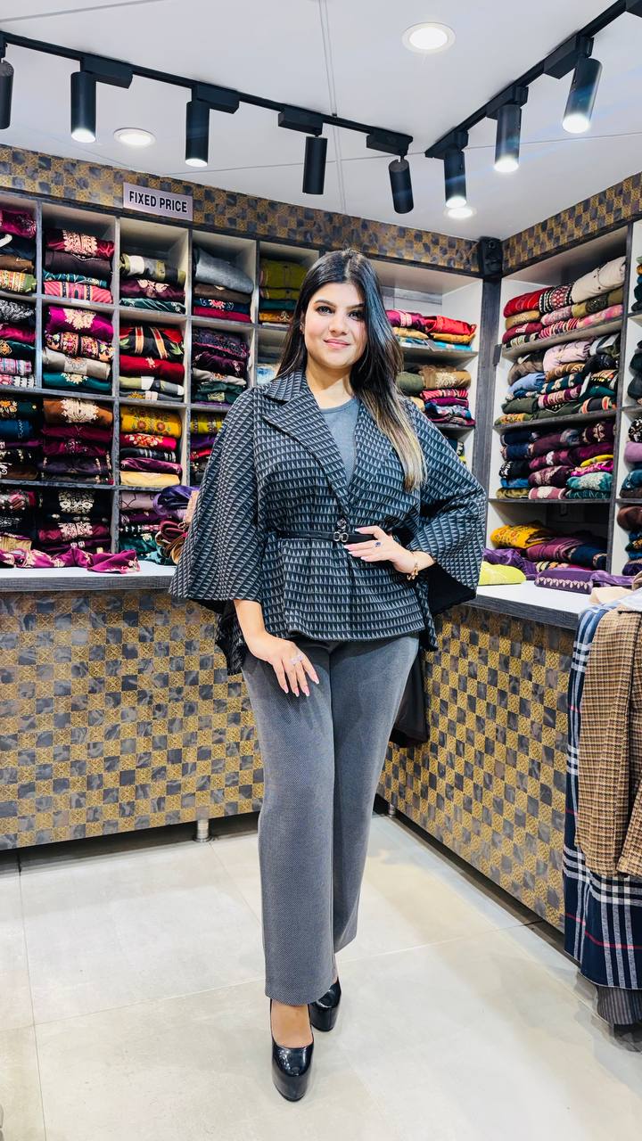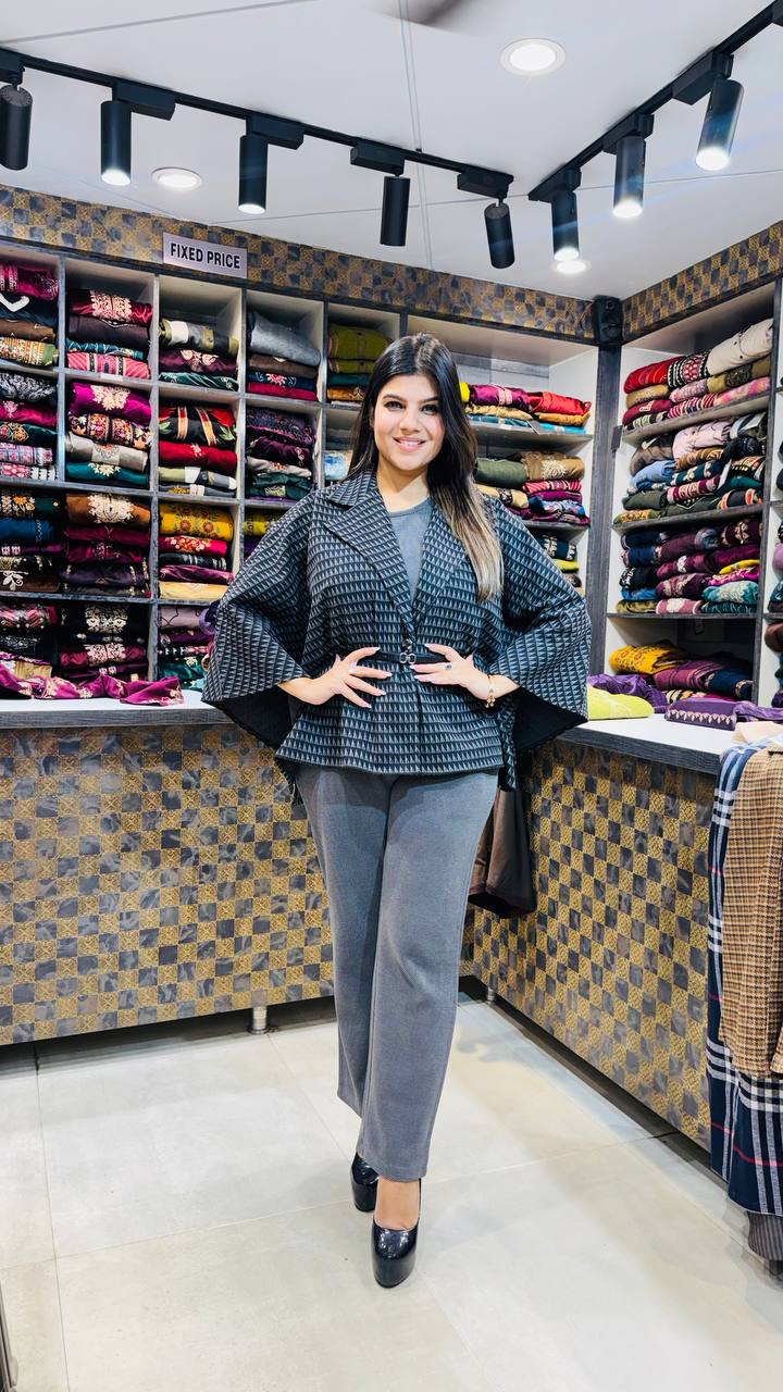 β¨ Design: Textured Geometric Shrug β’ Structured Collar β’ Flared Sleeves β’ Minimalist Inner β’ Straight Pants