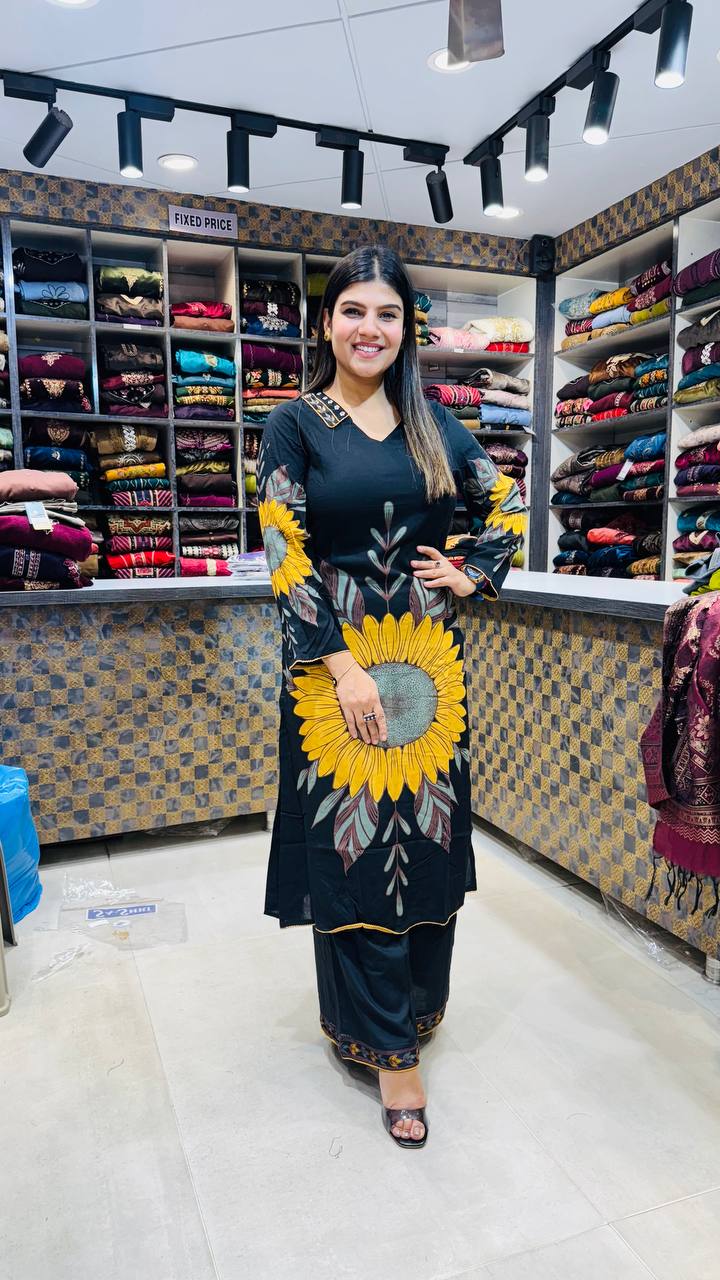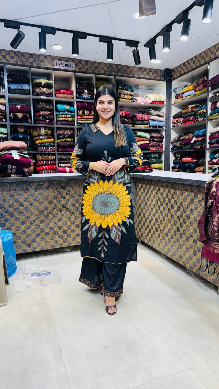 Made from premium German cotton, this striking black suit showcases a radiant sunflower-inspired print that instantly catches the eye. The golden-yellow bloom on the front brings warmth and vibrancy, balanced by subtle leaf motifs on the sleeves and borders. Designed for comfort with a touch of bold elegance, it’s a perfect fusion of art and sophistication for any casual or festive outing.