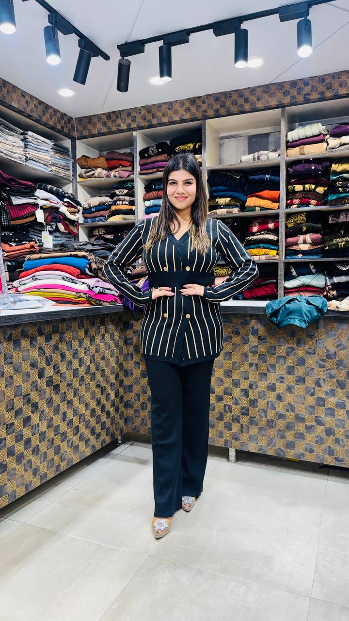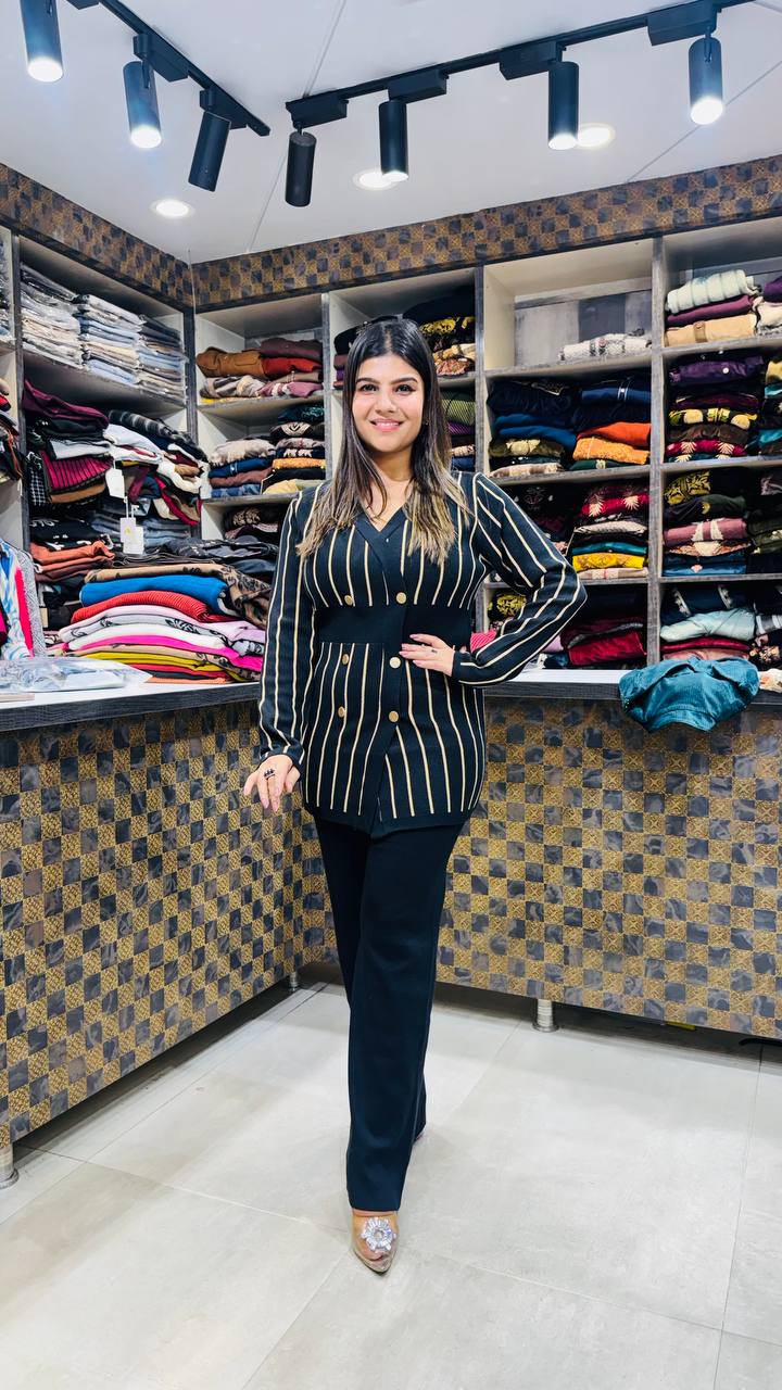 A sleek and modern co-ord set crafted from soft, warm knitted fabric — perfect for winter outings and elevated everyday fashion. The top features a black base with vertical gold-beige stripes, creating a sharp, lengthening effect that adds instant sophistication. The double-breasted button detailing and structured waist panel give it a tailored, blazer-inspired silhouette.