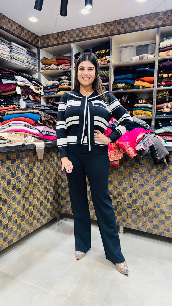 A chic and cozy knitted winter top available in two elegant shades — black-white and tan-white. Designed with bold horizontal stripes and a stylish tie-neck detail, this top blends warmth with a polished modern look. The soft, warm knitting fabric ensures comfort, while the structured pattern adds a premium touch perfect for everyday winter wear.