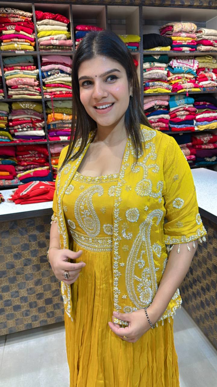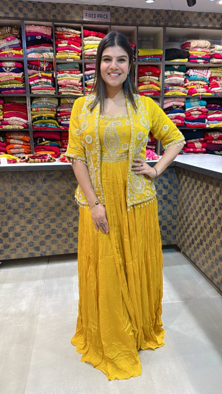 Radiate festive elegance in this mustard yellow silk ensemble, adorned with intricate white handwork embroidery that adds timeless charm. The outfit features a floor-length flared gown paired with a beautifully embroidered short jacket, creating a regal layered look. The paisley and floral motifs shimmer gracefully, giving it a rich, handcrafted appeal. Perfect for weddings, festive gatherings, or daytime celebrations — this piece blends royalty, grace, and artisanal finesse.