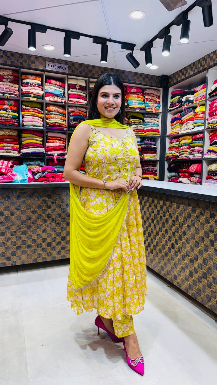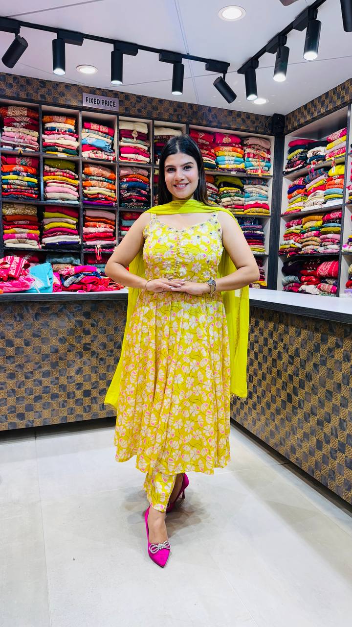 Radiate joy and freshness with Sunbloom, a charming Premium Crape ensemble in a lively lemon yellow tone. The outfit features a floral printed design that exudes brightness and feminine charm. The flowy crape fabric offers an elegant drape, while the matching dupatta completes the sunny, graceful look β perfect for festive mornings or cheerful daytime gatherings.