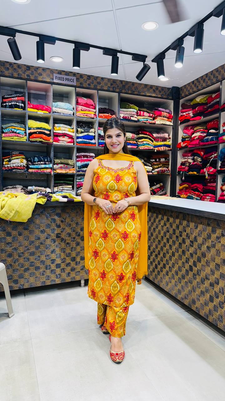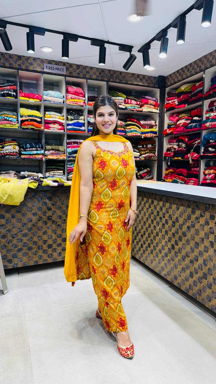 A vibrant 3pc ensemble crafted in premium cotton, designed in a radiant mustard yellow base that instantly uplifts the look. The kurta features bold traditional leaf and floral motifs in shades of red and olive, arranged in a symmetrical pattern that creates strong visual impact. The sleeveless cut with a softly detailed neckline keeps the silhouette modern and fresh. Paired with coordinated straight pants in matching print and a solid mustard dupatta that balances the overall design, this outfit is perfect for daytime festivities and summer celebrations.
