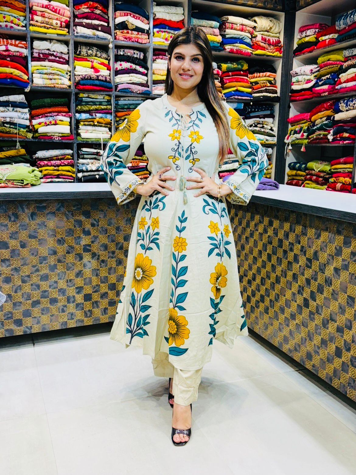 Sunflora is a charming Premium Cotton outfit designed in a soft Cream base, beautifully highlighted with bold floral prints. The kurti features large sunflower-inspired motifs in warm Yellow tones paired with elegant Teal leafy patterns, creating a fresh and lively visual appeal.