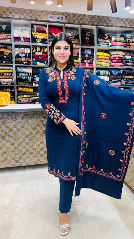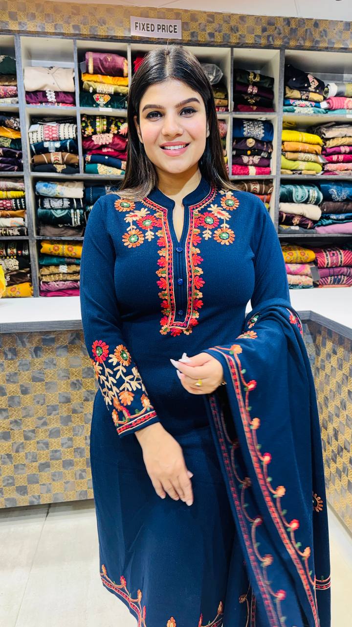 Tasneem is a refined Deep Teal Premium Knitted 3-piece suit designed for elegant everyday luxury. The shirt features detailed multicolour floral embroidery along the neckline, sleeves, and borders, adding warmth and contrast to the rich blue base.