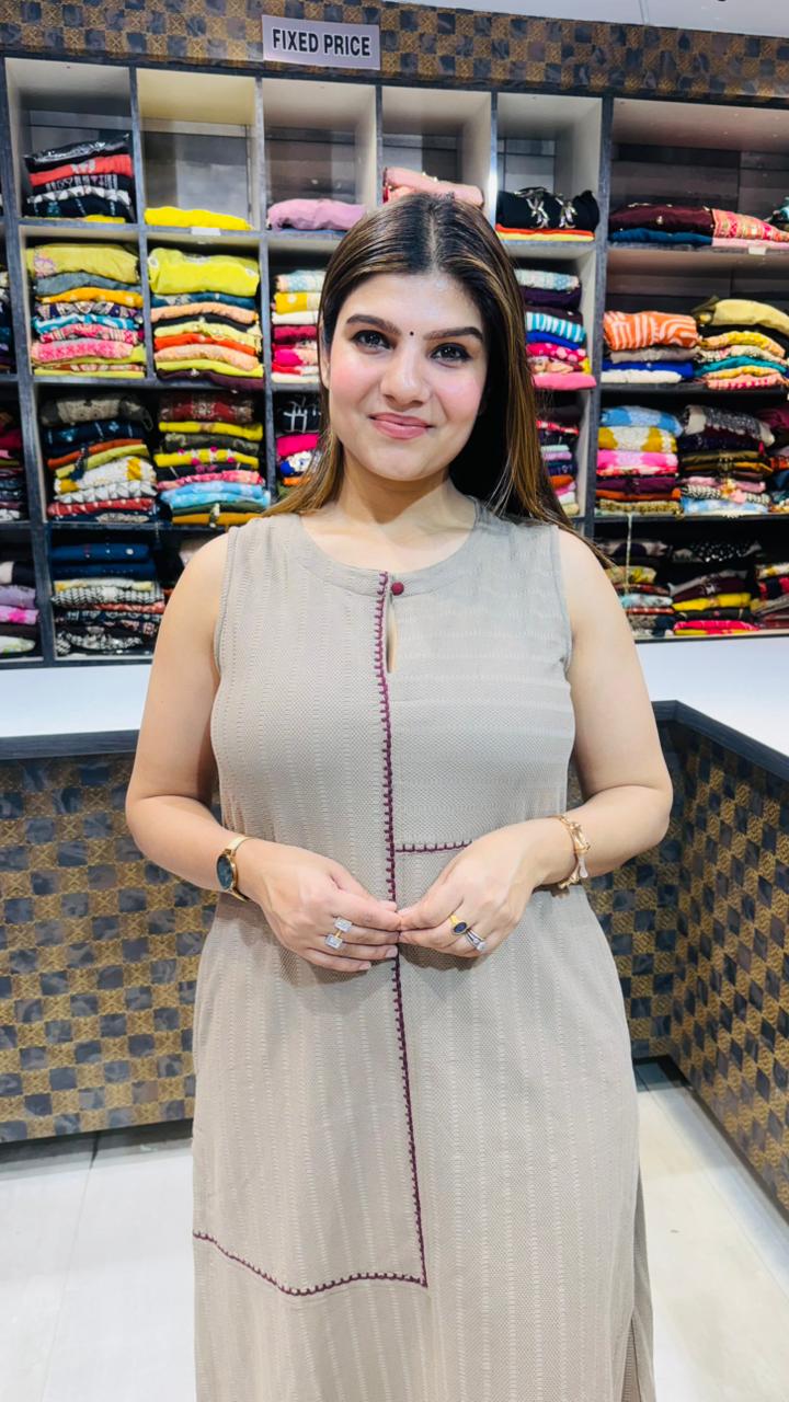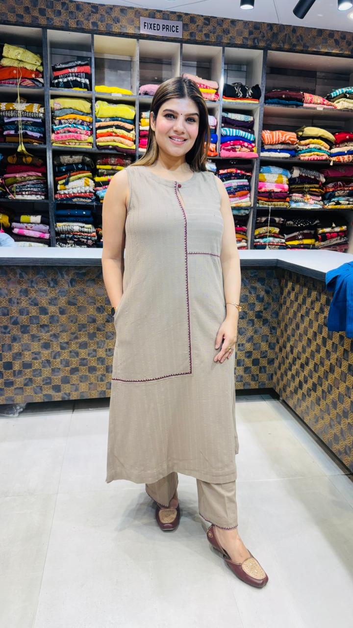 A modern and comfortable taupe beige co-ord set crafted from premium knitted fabric that is soft, breathable, and stretchable for all-day comfort. The sleeveless shirt features a minimal textured knit pattern with contrast stitch detailing, giving the outfit a clean and contemporary look. Paired with matching straight pants, this set offers a relaxed yet stylish silhouette, perfect for casual outings, travel wear, or effortless everyday fashion.