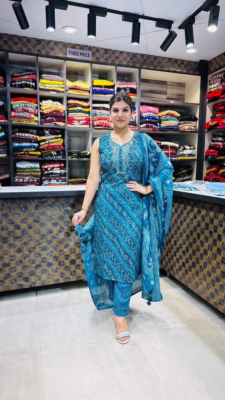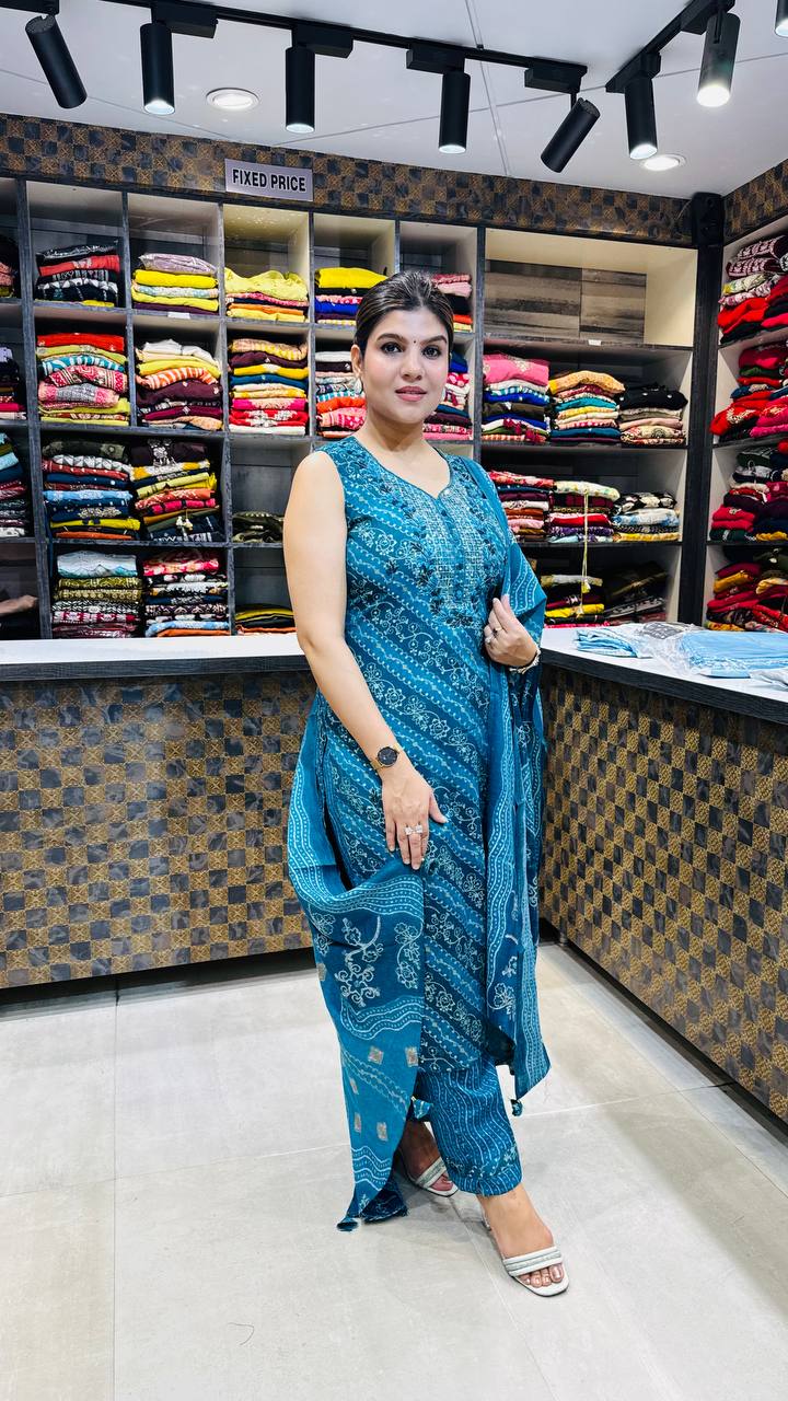 Tealina is a refreshing Premium Cotton 3-piece suit crafted in a vibrant Ocean Teal shade with intricate ethnic print detailing all over. The shirt features delicate threadwork on the neckline, enhancing its traditional charm with a refined touch. The diagonal and linear printed patterns create a graceful flow, giving the outfit a balanced and elegant look.