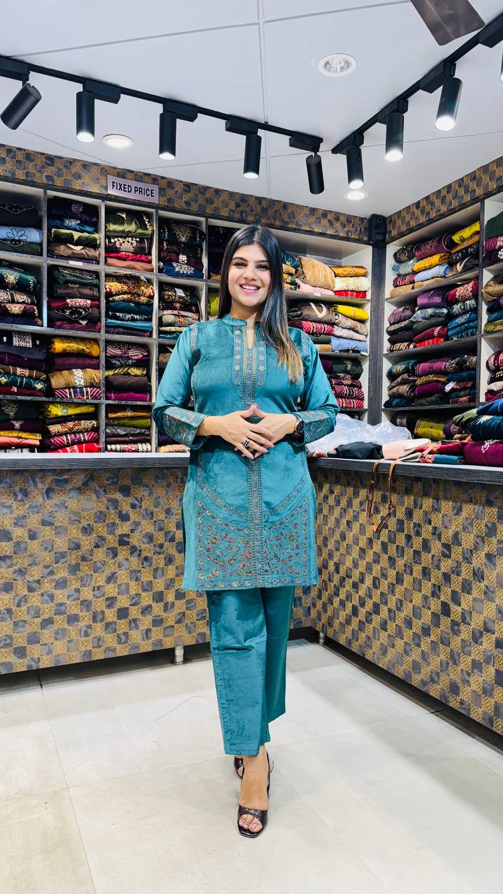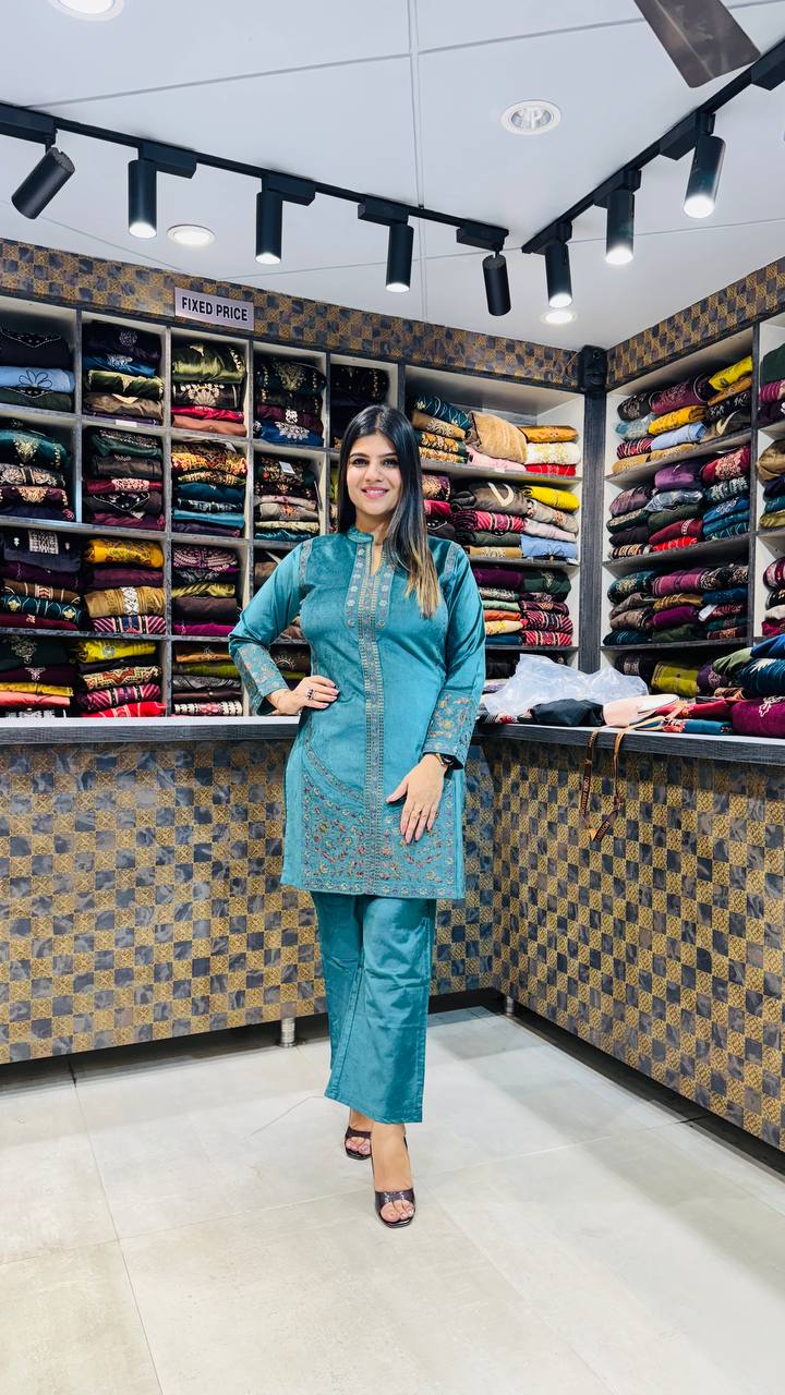 Tezrah blends the richness of teal-green cotrize fabric with finely detailed multicolour Kashmiri-inspired embroidery on the neckline, sleeves, and front panel. The premium cotrize texture adds a soft, velvety sheen, while the coordinated straight-fit pants complete this elegant 2-piece set. Perfect for semi-festive outings, office wear, and graceful everyday styling.