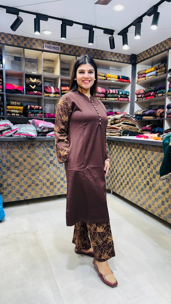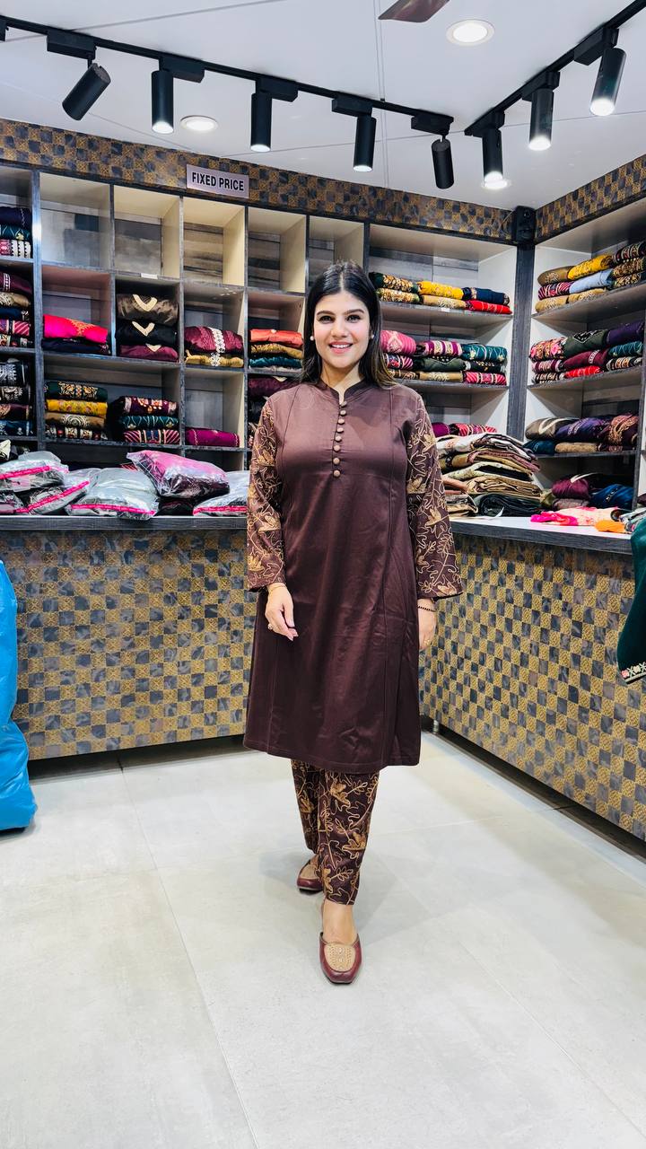 Embrace warm sophistication in this deep truffle brown ensemble crafted from premium imported fabric. The kurta showcases delicate golden embroidery on the sleeves paired with coordinating printed pants, blending earthy richness with subtle luxury. The sleek front buttons and mandarin collar elevate its minimal yet graceful look β perfect for both office elegance and festive charm.