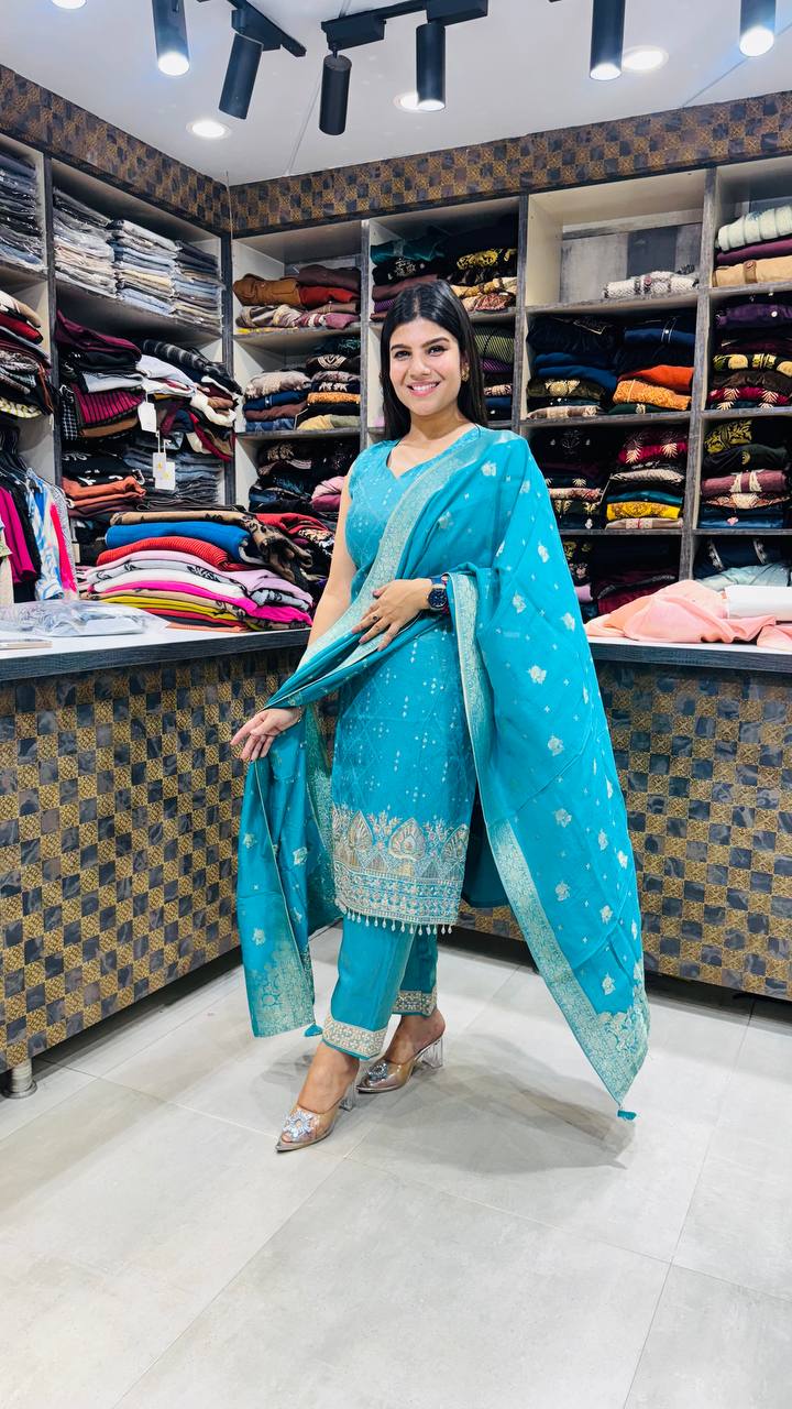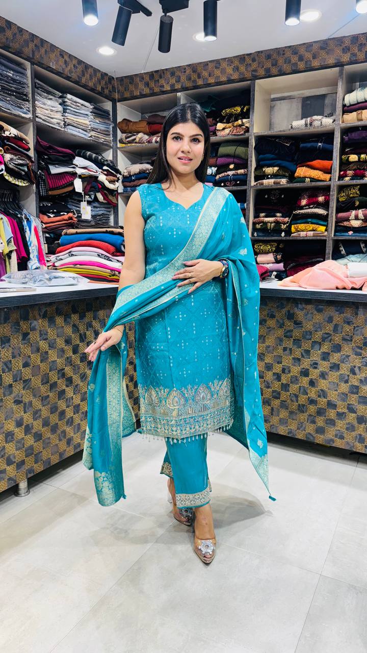 Turqeen showcases a refreshing turquoise silk suit paired with elegant gold zari embroidery along the neckline, hem, and pant borders. The premium silk fabric adds a soft lustrous shine, while the matching dupatta enhances the look with delicate motifs. A perfect blend of festive elegance and airy sophistication.