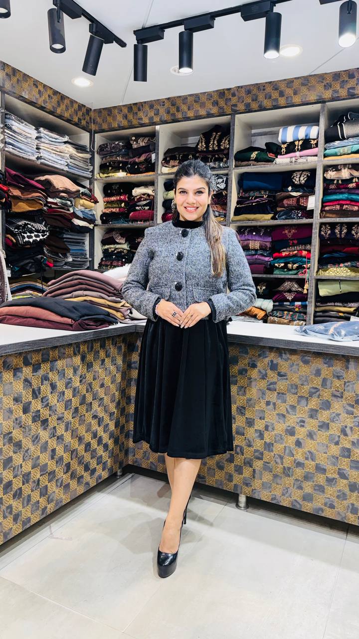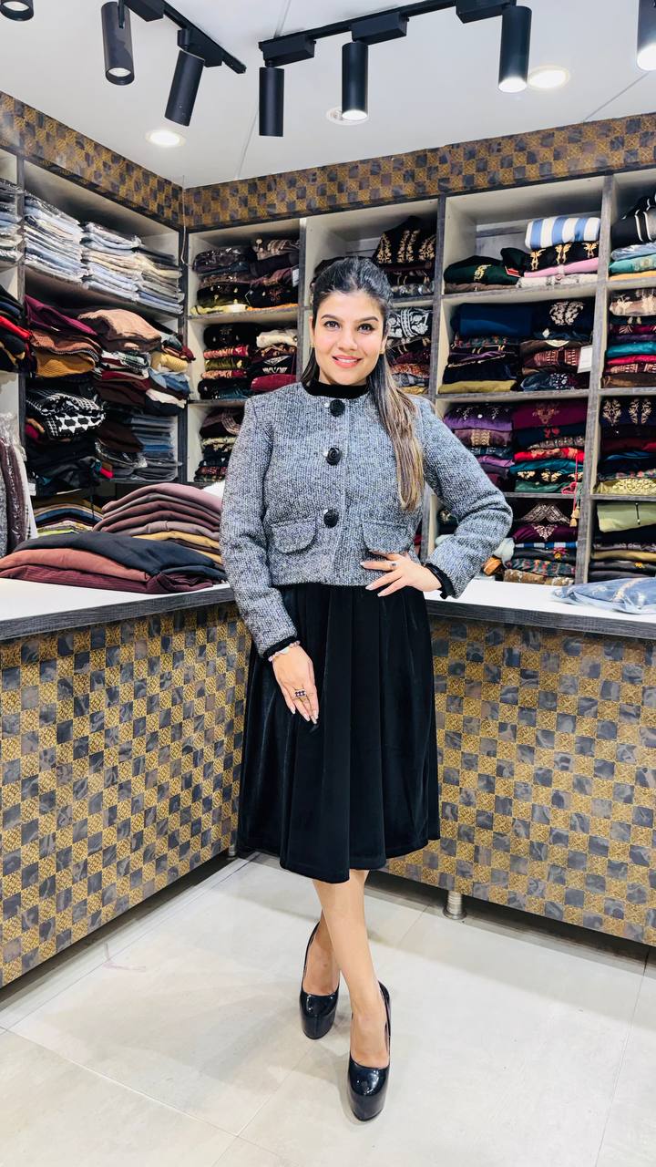 Velmora is a refined two-piece winter ensemble featuring a textured charcoal-grey premium velvet jacket paired with a deep black flowing muddy skirt. The jacket is tailored with a clean round neckline, bold front buttons, and a cropped structured silhouette that defines the waist while maintaining warmth.
