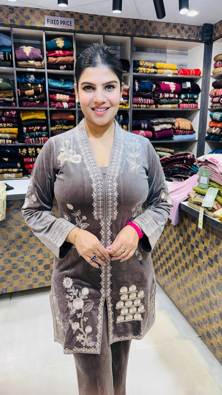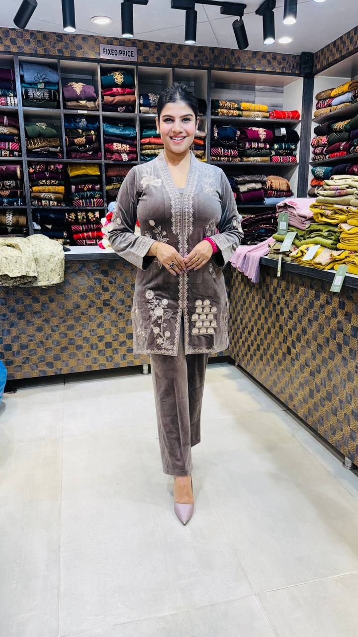 ndulge in the charm of understated luxury with our Premium Velvet 2-Piece Suit in an enchanting mocha taupe hue. The soft, plush velvet fabric drapes beautifully, offering a royal yet effortless appeal. Delicate tonal embroidery graces the front and sleeves, adding a touch of feminine elegance. Paired with matching straight-fit velvet pants, this ensemble blends timeless sophistication with cozy comfort — perfect for festive soirées or evening elegance.