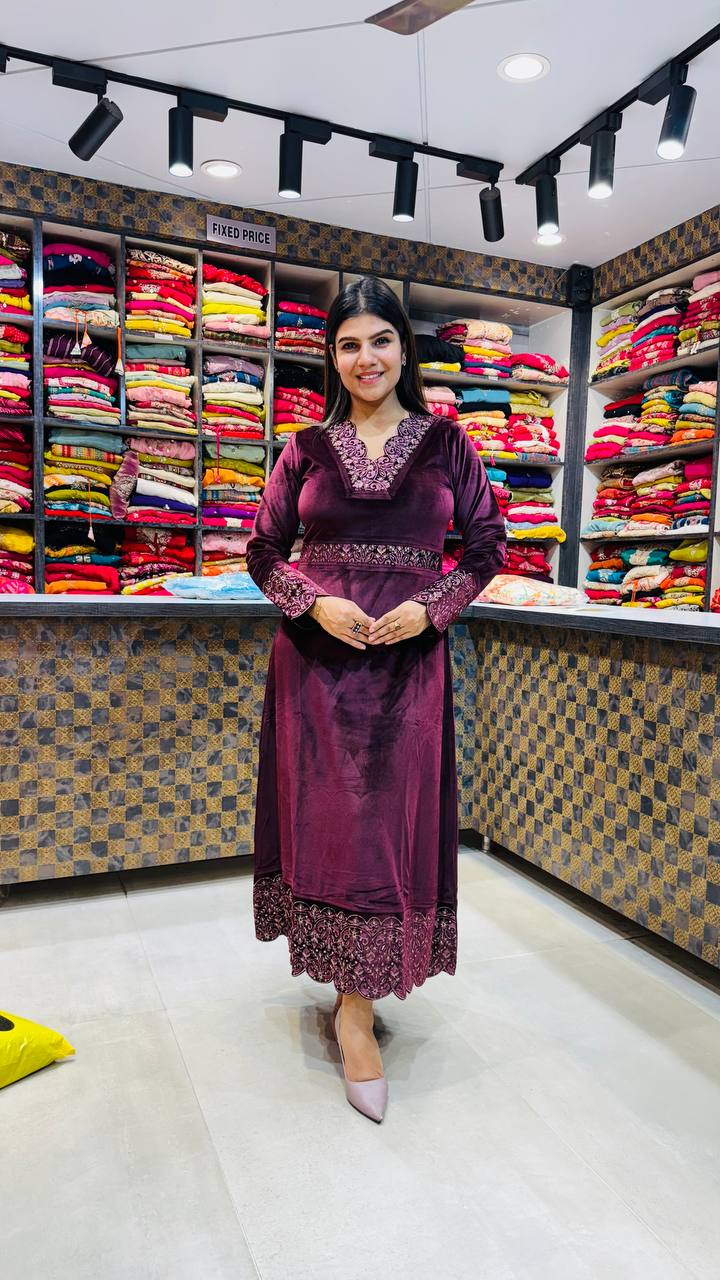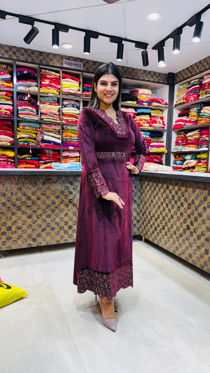 Radiate regal grace with Velvette, a luxurious ensemble crafted from Premium Velvet Fabric in a rich wine shade. The design features detailed embroidered patterns along the neckline, sleeves, and hem β creating a perfect balance of sophistication and charm. The smooth velvet finish adds depth and richness, making it ideal for festive occasions and elegant gatherings.