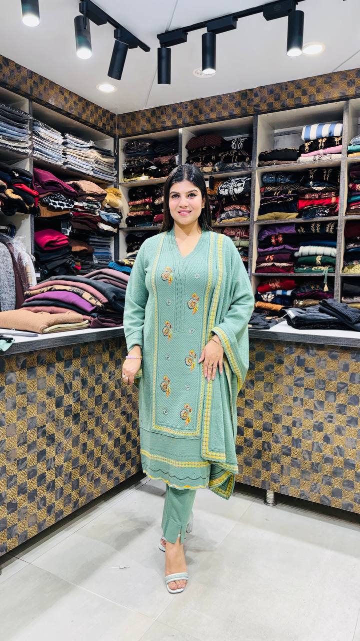 Verdessa is a Premium Knitted 3-Piece ensemble in a serene sage-mint green tone, designed for refined winter comfort. The shirt features delicate golden-mustard floral embroidery placed vertically across the front, subtly enhancing the silhouette without overpowering the look.
